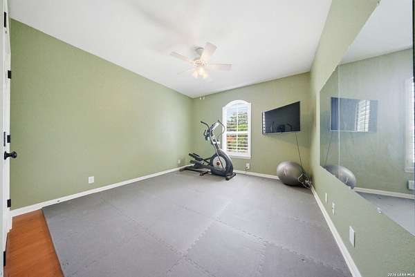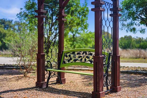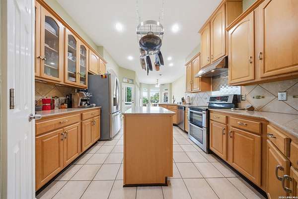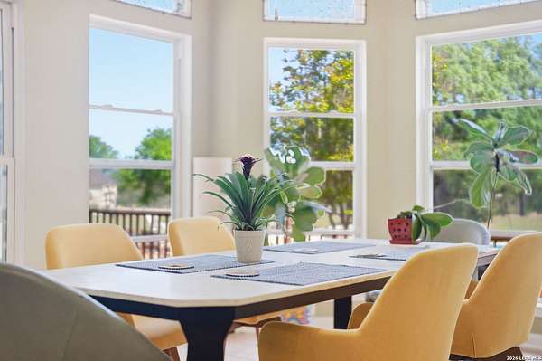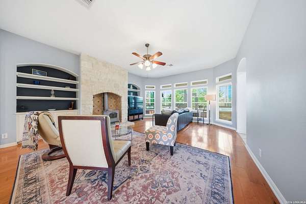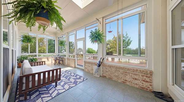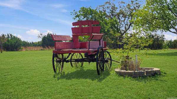 Peaceful and secluded Hill Country retreat situated on 5 oak-studded acres, offering a true private country setting with gated entry and full perimeter fencing. This beautifully landscaped property features a one-story brick and rock home surrounded by mature trees, long-range views, and inviting outdoor spaces including an expansive wood deck, pool, hot tub, and multiple areas to relax and unwind. Inside, the home offers an open living area with hardwood floors, built-ins, and a floor-to-ceiling rock fireplace with wood-burning stove. The chef's kitchen includes stainless steel appliances, double ovens, a center island, and breakfast bar, flowing seamlessly into a bright dining area. The private primary suite features outdoor access and a European-style bath, while the split floorplan offers spacious secondary bedrooms and a dedicated study with flexibility for formal dining. A glass-enclosed patio provides year-round enjoyment of the scenic surroundings. Additional highlights include an artist studio or cottage with A/C, tool shed, oversized garage, and ample storage. This property offers the perfect blend of comfort, privacy, and Hill Country charm.
