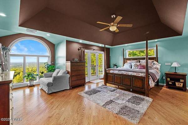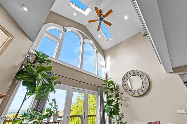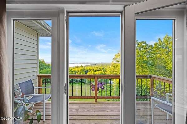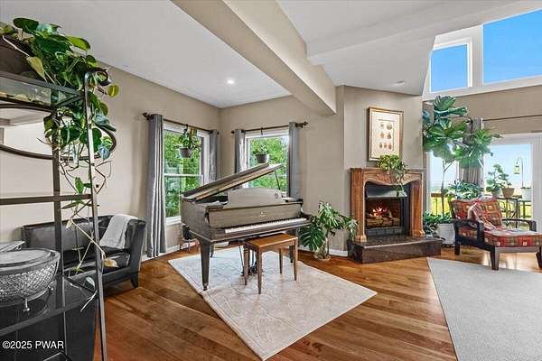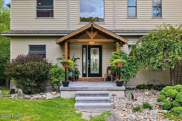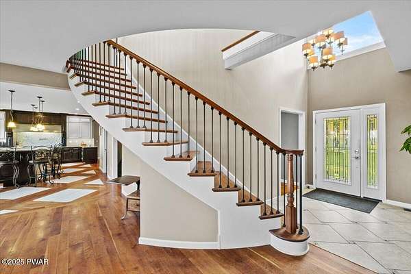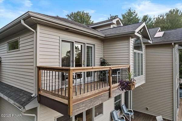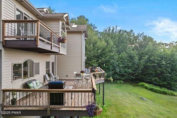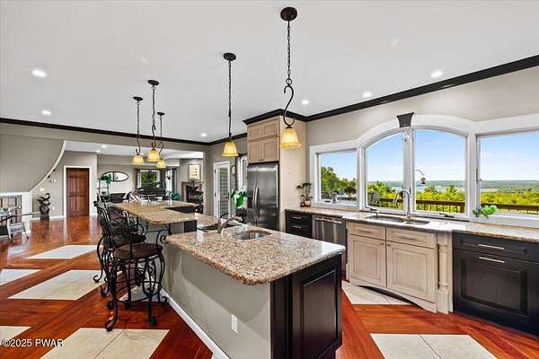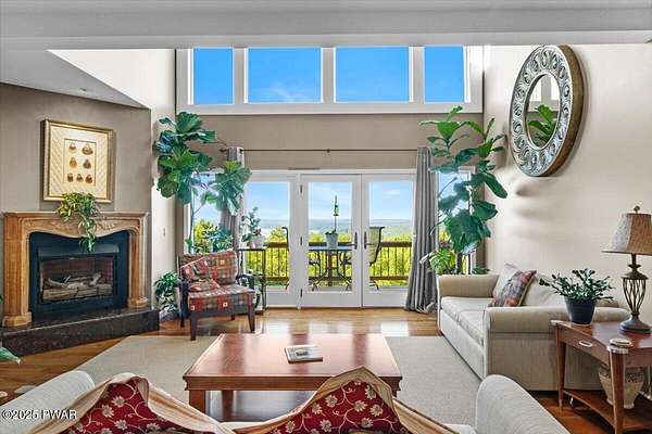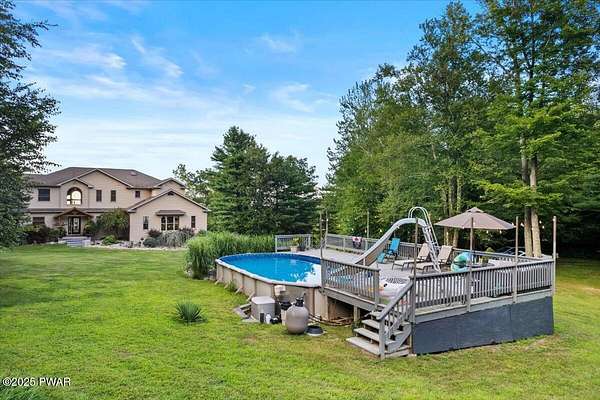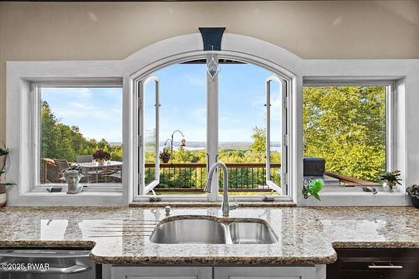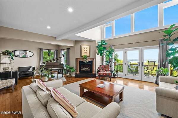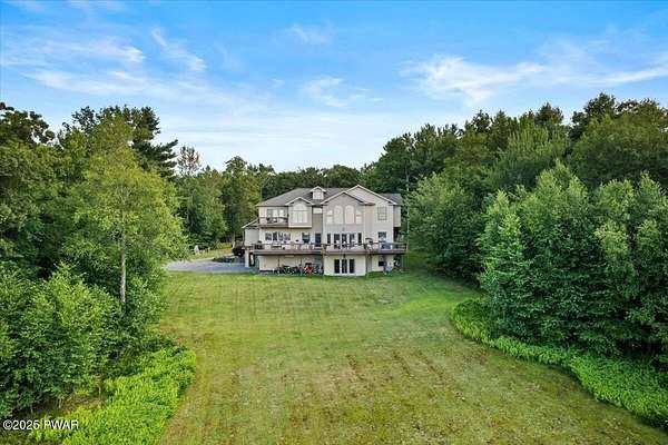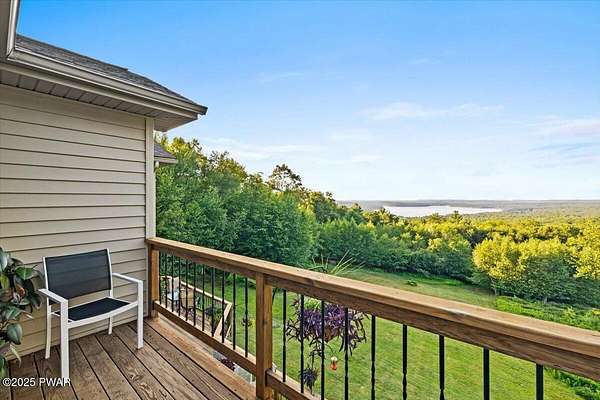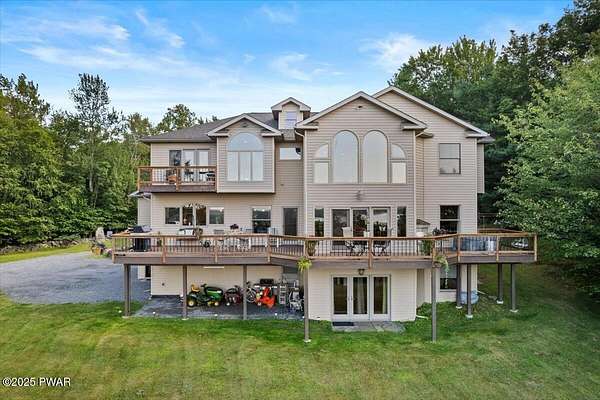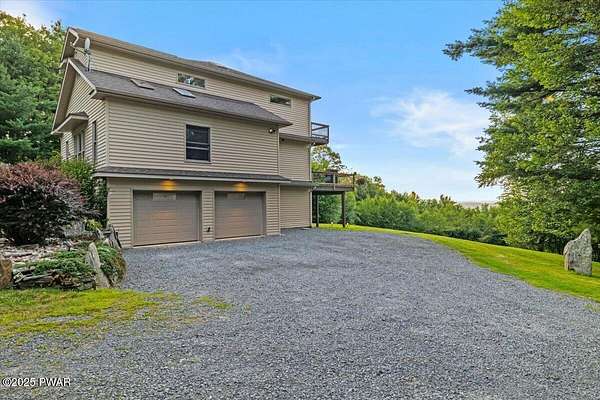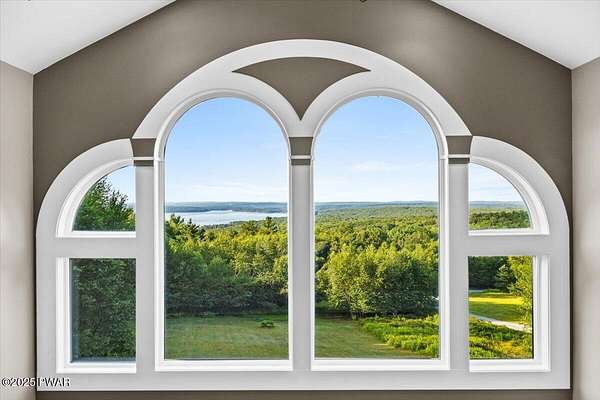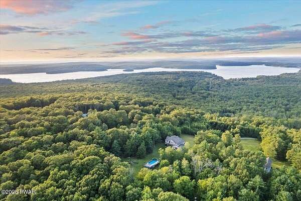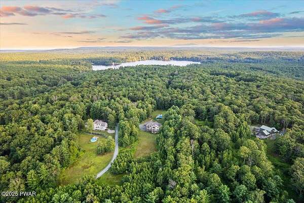 Perched high on a scenic hilltop in the heart of the Poconos, this extraordinary estate offers nearly 7,000 square feet of refined living space and an unmatched one-of-a-kind lake view that must be seen to be believed. Surrounded by natural beauty and ultimate privacy, this home was designed to capture the serenity of its surroundings from nearly every room.The entire first and second floors are finished with beautiful cherry and ash hardwood floors. Radiant heat warms the entire first floor as well as two of the bedrooms, providing exceptional comfort throughout the colder months.As you enter, you're welcomed by soaring ceilings, expansive windows, and an open floor plan that flows effortlessly--perfect for both entertaining and everyday luxury living. From the cozy fireplace and chef-style kitchen to grand living areas and private suites, every inch of this home has been thoughtfully crafted.Step outside to enjoy the peaceful sound of nature from your multiple decks and patios, all overlooking the lake and the lush Pocono landscape. On the 4th of July, you'll have a front-row seat to the area's spectacular fireworks show--right from the comfort of your own property.Bonus Feature: Tucked discreetly at the back of the property is a 25x40 detached garage--ideal for a workshop, boat or RV storage, car collection, or additional recreational space.Whether you're seeking a private family retreat, a forever home, or a luxurious getaway, this property is truly a rare gem in the Poconos.