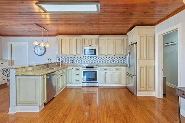 - Breakfast Bar, Ceiling Cathedral, Lighting Recessed, Pantry, Woodwork Stained