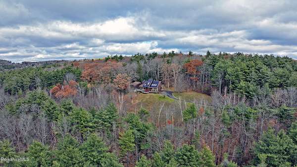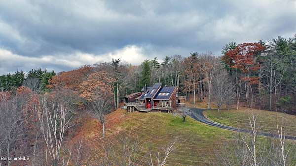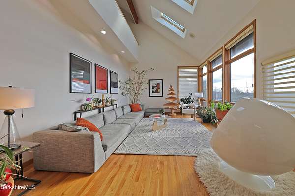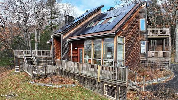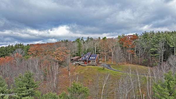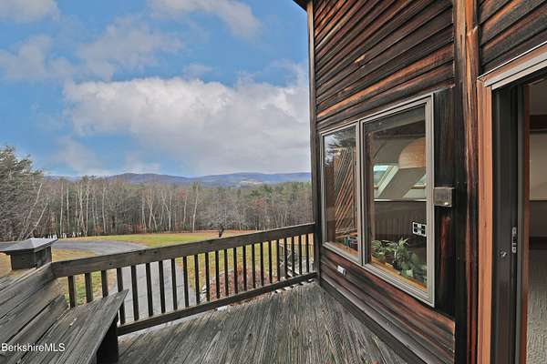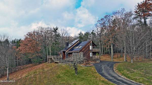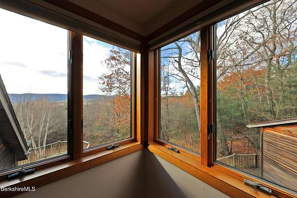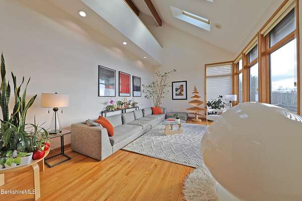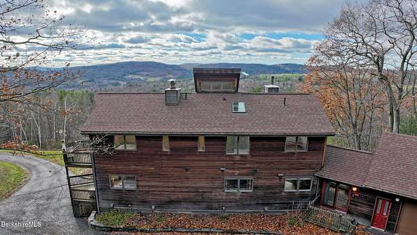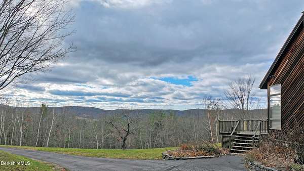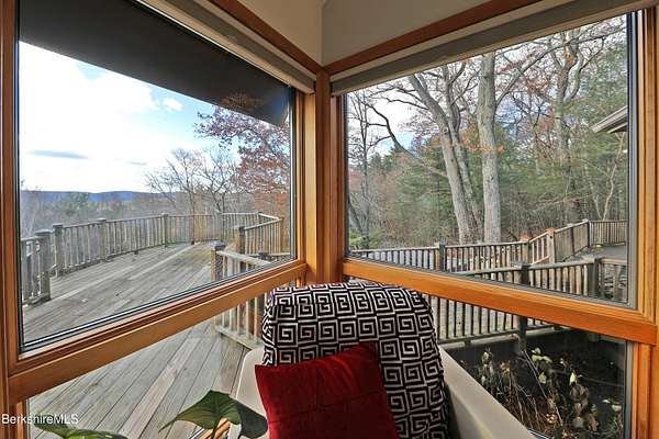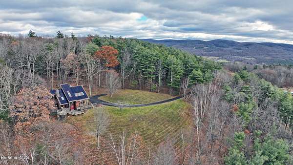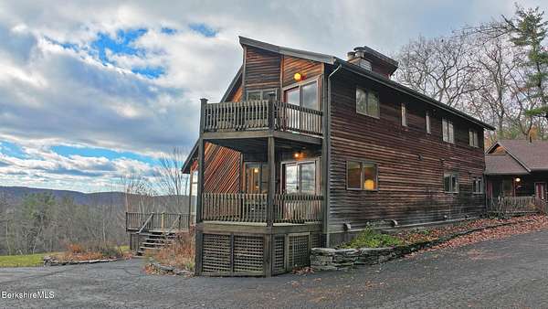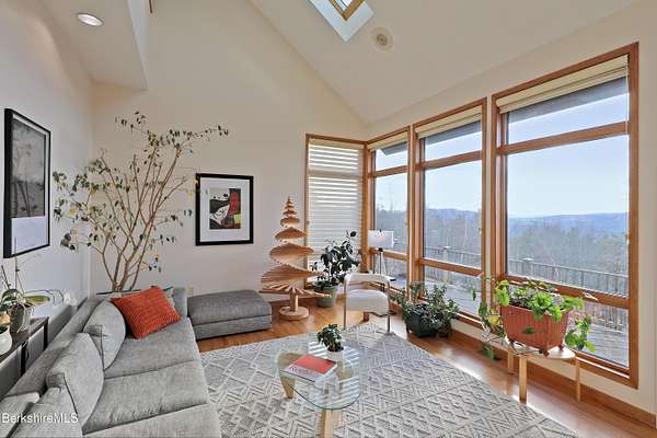 PANORAMIC VIEW, PRIVACY AND A STUNNING CONTEMPORARY is waiting to become your country sanctuary. As you drive up the long, private driveway, you feel your shoulders relax and then..peaceful thoughts take over as you soak in the sweeping south west view at the top of your private hill. The multi-level design of this home offers living with peace and tranquility for both gathering and quiet time alone, all while capturing the nature surrounding you on 5+ acres. Main level bedroom with private deck, full bath, office, cozy den and open kitchen/dining with direct access to the attached 3 car heated garage for convenience, dramatically opens to the Great Room in one direction and the primary bedroom with fireplace and newly designed luxurious ensuite bath with another guest bedroom and bath on the upper level. Most rooms in the house take in the vista wrapping you with nature and natural light. Step out to the spacious decking and take a dip in the salt water hot tub or go out the front door to take a hike. Only a short distance to theaters, restaurants, shopping, farmer's markets, skiing and Tanglewood, everything about this house and location is perfect!