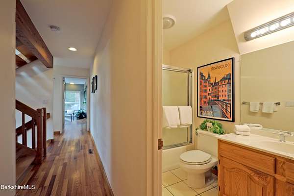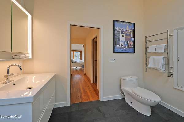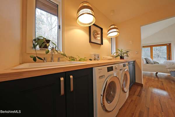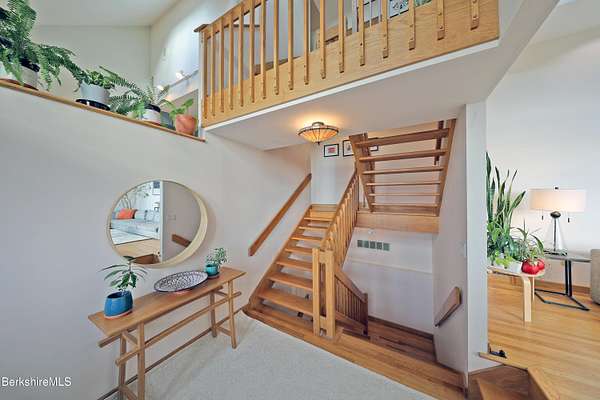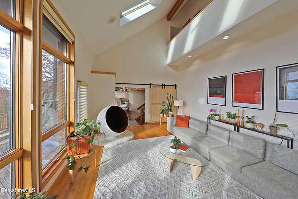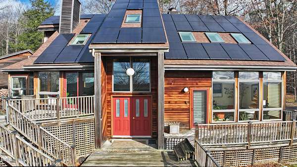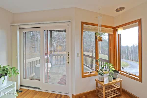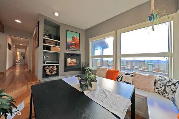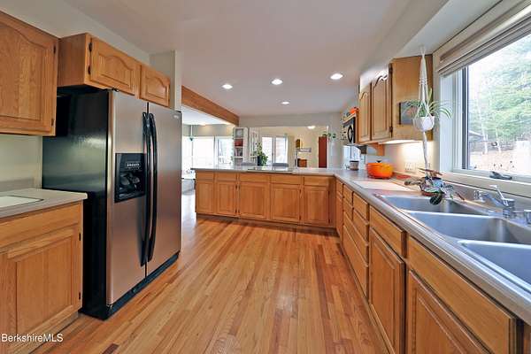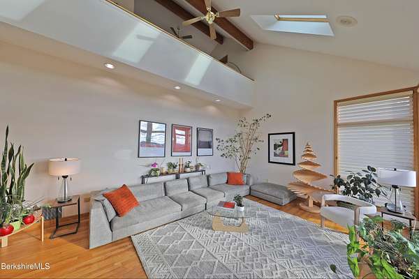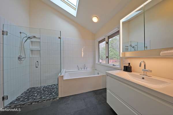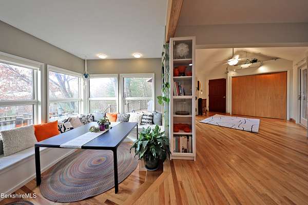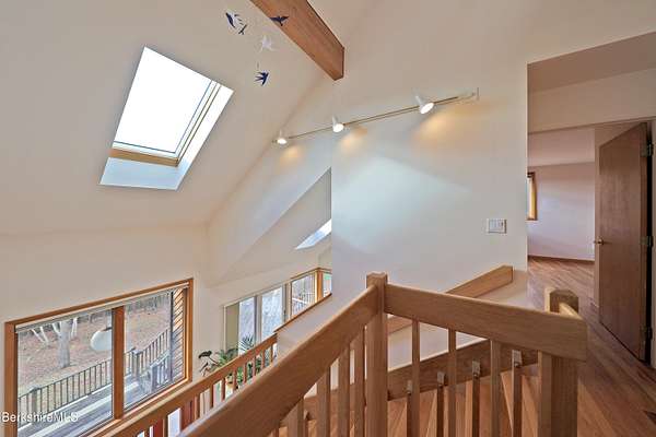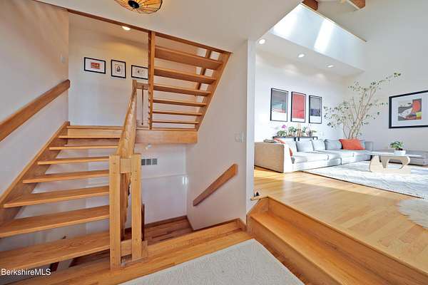 PANORAMIC VIEW, PRIVACY AND A STUNNING CONTEMPORARY is waiting to become your country sanctuary. As you drive up the long, private driveway, you feel your shoulders relax and then..peaceful thoughts take over as you soak in the sweeping south west view at the top of your private hill. The multi-level design of this home offers living with peace and tranquility for both gathering and quiet time alone, all while capturing the nature surrounding you on 5+ acres. Main level bedroom with private deck, full bath, office, cozy den and open kitchen/dining with direct access to the attached 3 car heated garage for convenience, dramatically opens to the Great Room in one direction and the primary bedroom with fireplace and newly designed luxurious ensuite bath with another guest bedroom and bath on the upper level. Most rooms in the house take in the vista wrapping you with nature and natural light. Step out to the spacious decking and take a dip in the salt water hot tub or go out the front door to take a hike. Only a short distance to theaters, restaurants, shopping, farmer's markets, skiing and Tanglewood, everything about this house and location is perfect!