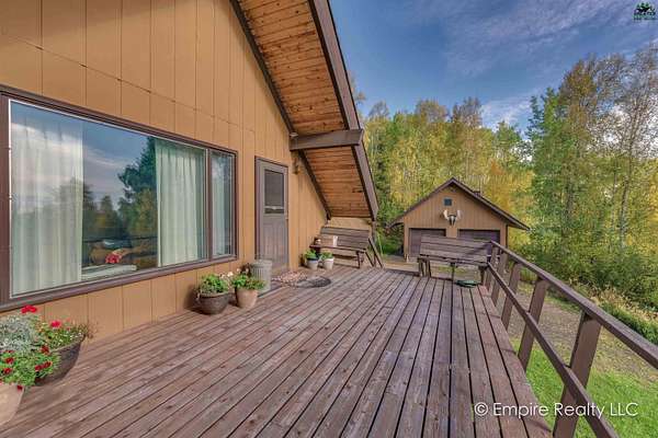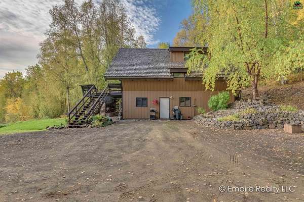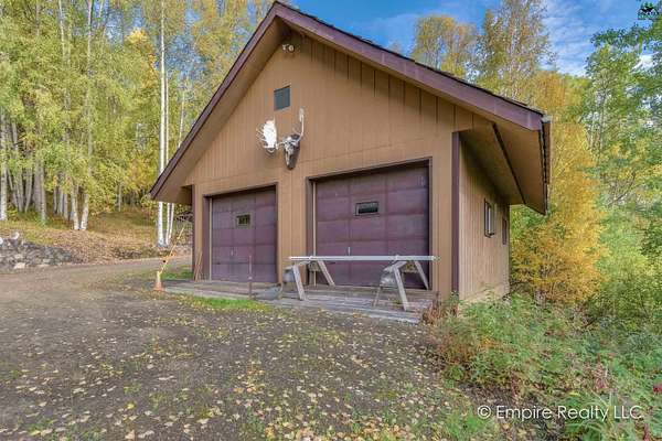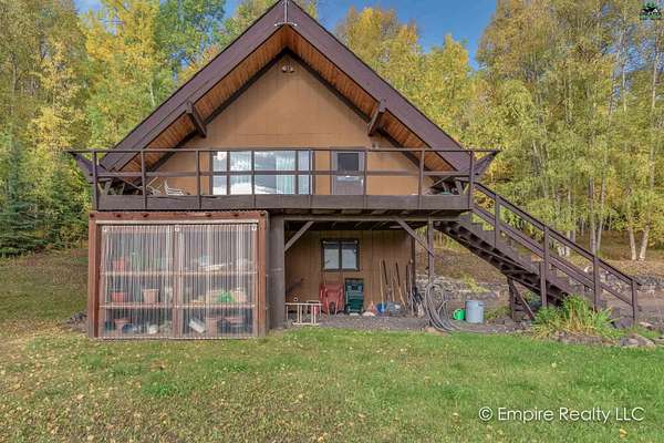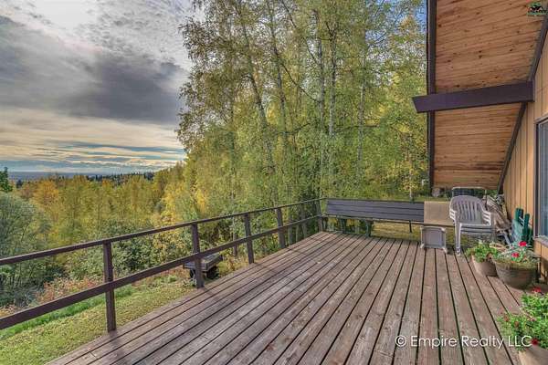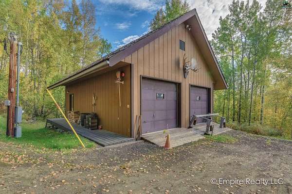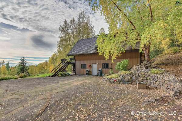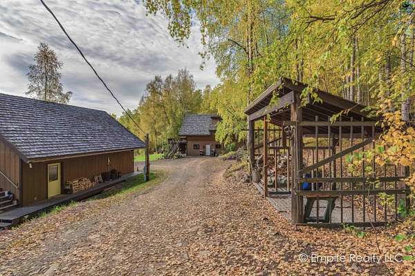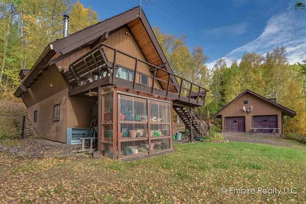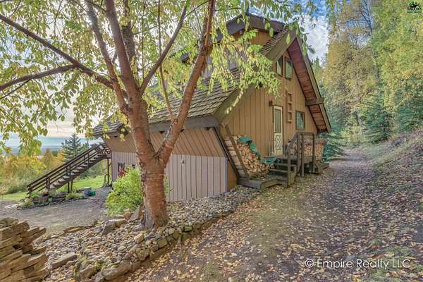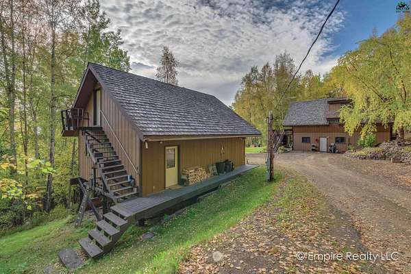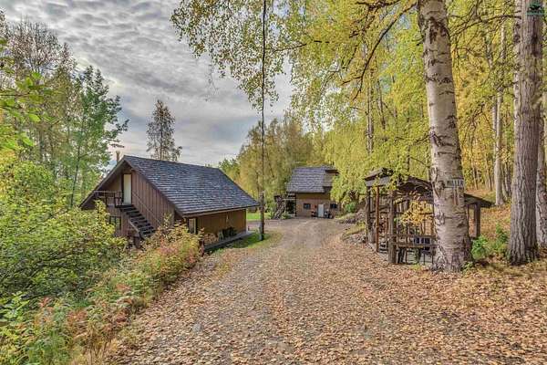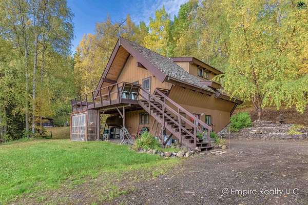 Charming hillside chalet tucked away on Chena Ridge with a view of the river and mountains beyond. Single owner home on an absolutely beautiful lot surrounded by trees and hardly a neighbor in sight. Most of the original rustic details are still visible, from the cedar shake roof to the beams and tongue and groove vaulted ceiling inside. On the ground floor, modifications were made a few years ago with the addition of a kitchenette and bathroom to have a stand alone MIL apartment and because the utilities are on that level, including the washer and dryer, there's really no need to ever go upstairs! But go upstairs you must to fully appreciate the view, the southern facing deck, the vaulted ceiling, woodstove and remodeled kitchen. There are two small bedrooms and a full bathroom on the same second story. From there a set of stairs leads up to the upper primary bedroom with en suite. Flexbility is the name of the game here, the house has electric heat originally and the owner burned a fair share of wood to supplement, or burned a fair share of wood for the heat and supplemented with electricity depending on how you want to approach it, and with the addition of the Toyo heater downstairs you can decide how much oil, electricity and wood you would like to burn and in what proportion. The detached garage is also similarly heated with a wood stove and a Toyo and has done plenty of time as a wood shop when not filled with cars. Above the garage is a massive amount of dry storage and, quite frankly, there is a massive amount of dry storage below the garage, too.