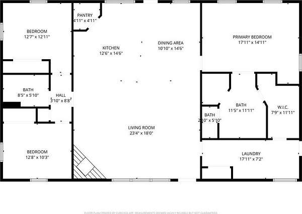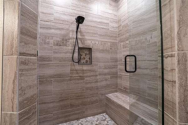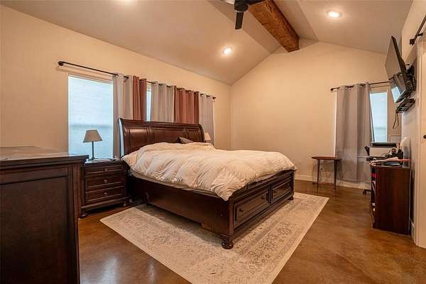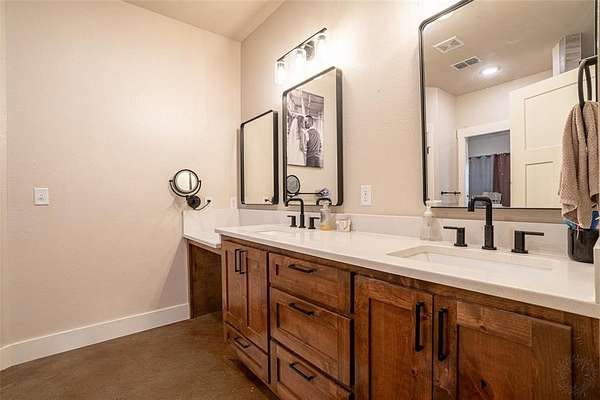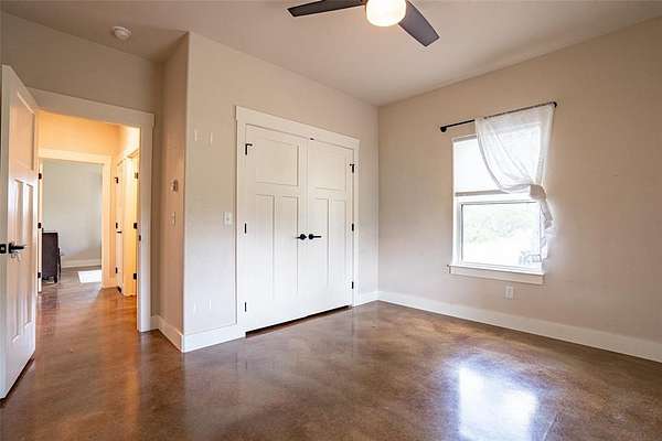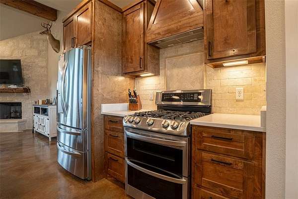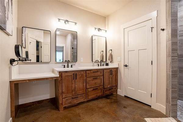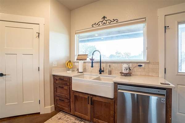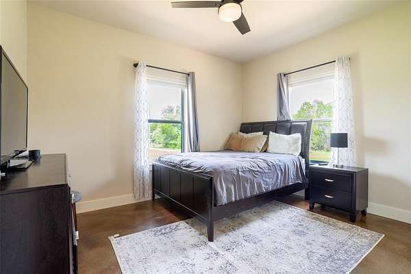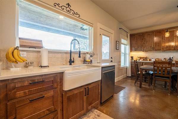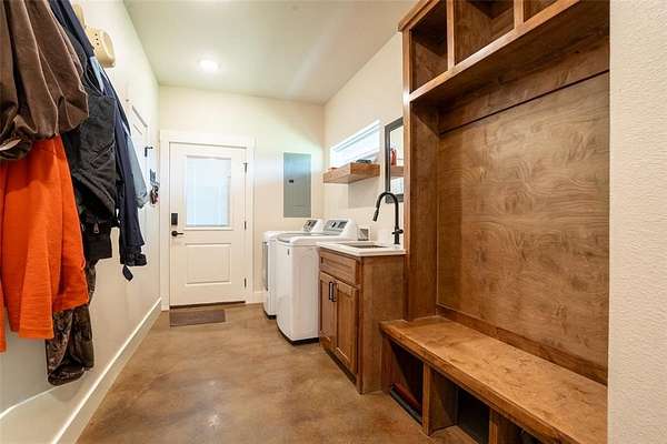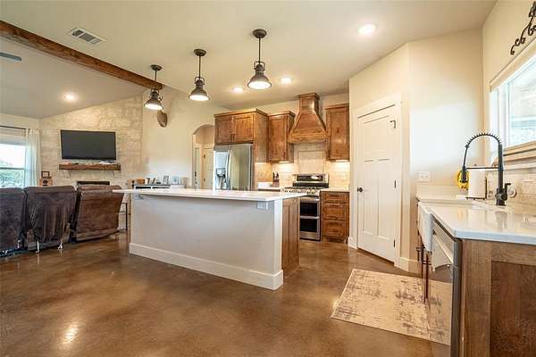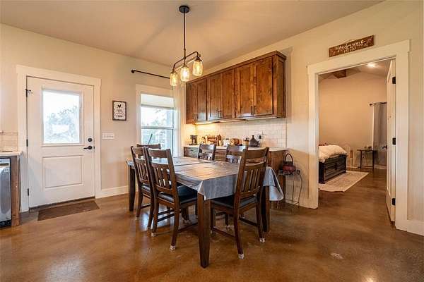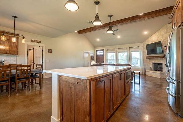 The home is a well-designed 3 bedroom, 2 bath modern farmhouse set on 54 acres, offering a comfortable open layout with a clean, functional feel throughout. The kitchen sits at the center of the home with a large island, built-in coffee bar, gas stove, and plenty of workspace, serving as a functional space for daily living. The living area offers a comfortable place to gather with a stone gas fireplace as a focal point, while a mud room and dual vanities in the primary suite add practical function throughout the home. The home also features a fenced yard surrounding the house, offering a defined outdoor space within the larger acreage.