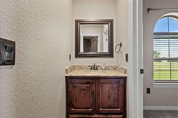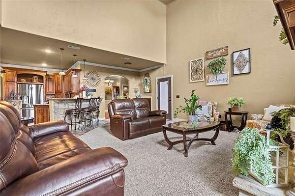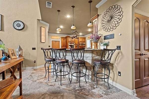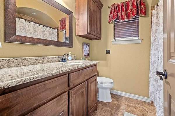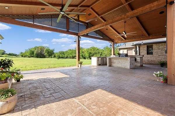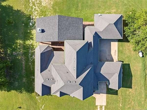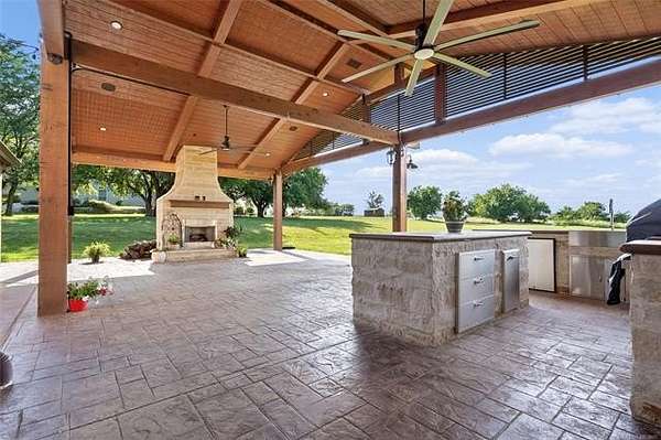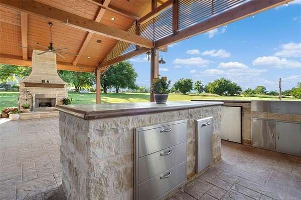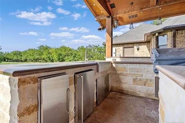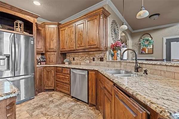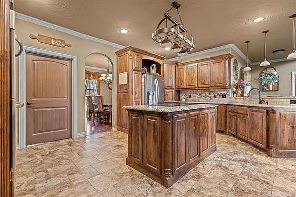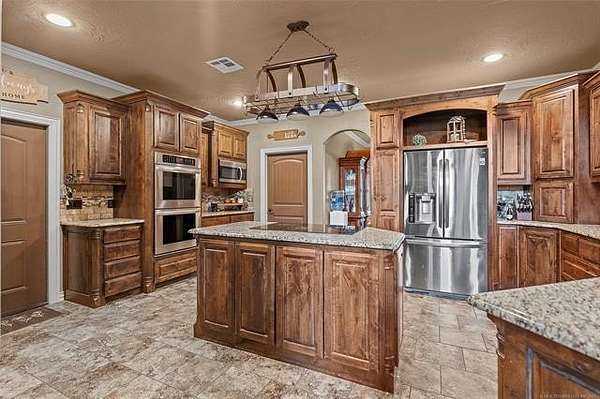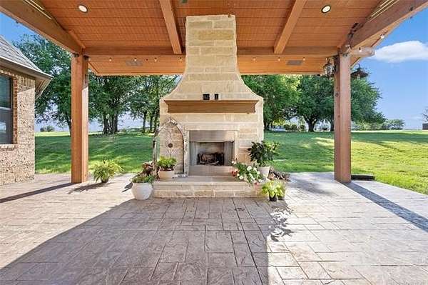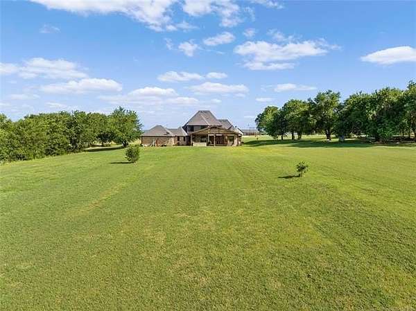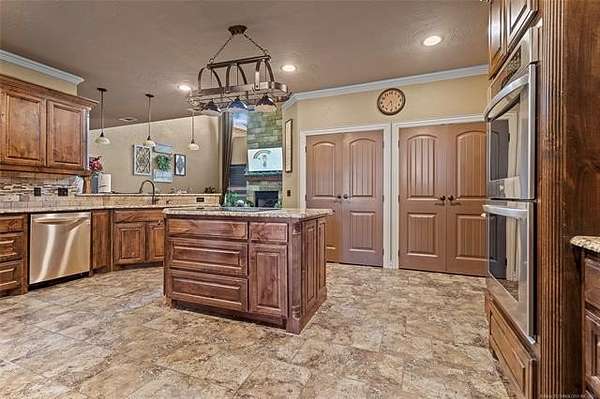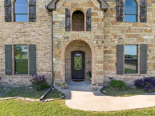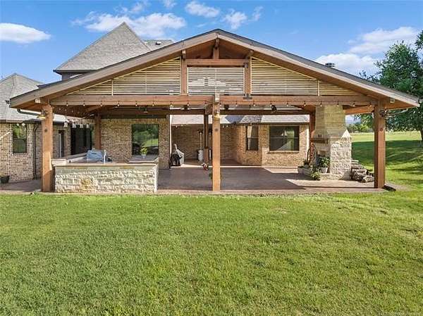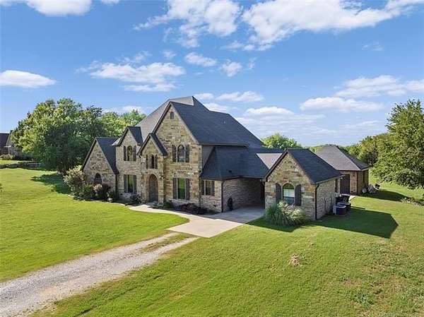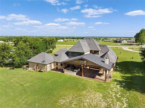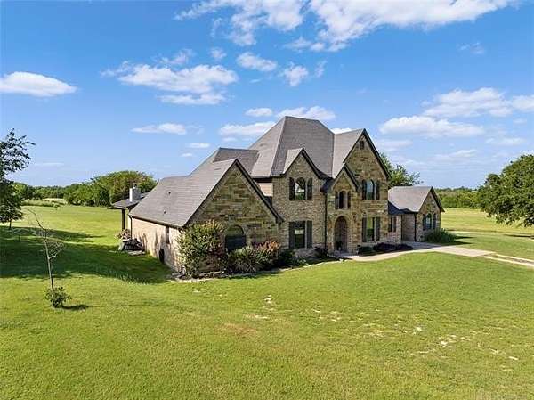 The magnificent home with stone and brick combination exterior, varied roof lines, and inset areas make this home unique and set apart from the rest and it sits on a 2.3-acre lot. Walk into a beautiful entry with insets for decor in the walls and hardwood flooring. Then enter into a large living area with high ceilings and a massive stone fireplace and lots of space. All this opens to a great kitchen with beautiful wood cabinets, granite counters, center island with cook top, double ovens, eat-in kitchen bar with stone facade, and a full wall pantry with 4 doors. Several arched doorways make the space unique. Off the kitchen is a large utility room extra cabinets and granite counter tops with enough space for an extra freezer and refrigerator. The outstanding master suite has spacious closet space including nice built-in units; the long dressing area has double sinks, wall mirrors, and beautiful cabinetry for storage. Also, the bath has a jetted tub and large tile shower. The downstairs is completed with another bedroom, guest bath and an office with a closet. Off the living area is a large, covered patio and beyond that is an outdoor kitchen that is the envy of everyone with a massive stone fireplace, tiled floor, extensive area for seating/party area, with long serving bar, refrigerator, ice maker, grill and gas burner all of these are built-in with lots of storage space. It is lighted and wired with speakers and a nice country view as well. You will have to see this for yourself! The upstairs area has a large living area, two nice sized bedrooms and a full bath. This large home has it all for a family and is not in any city limits. If you are looking for a beautiful home in a nice area, then this one is for you. It is all about location and this one is great. It is so close to Interstate 35 and only 85 miles to Dallas/Fort Worth area and only 95 miles to Oklahoma City. Lake Murray and Lake Texoma are just a few miles away for fun recreation and boating.