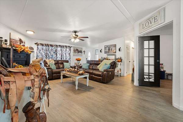 Welcome to this beautifully remodeled 4-bedroom, 2-bathroom home nestled on a stunning 5-acre horse property! This charming residence blends modern updates with country charm, offering the perfect retreat for horse lovers and those seeking wide open spaces. Enjoy peaceful mornings on the gorgeous covered front porch, and cozy evenings in the spacious, light-filled living areas. The home features a thoughtfully designed layout, updated finishes, and a warm, welcoming feel throughout. Equestrian enthusiasts will love the dedicated tack room and ample space to ride and roam. A convenient circle drive adds ease of access, while the fenced backyard provides a safe play area for kids and pets. Whether you're entertaining guests or enjoying the tranquility of rural living, this adorable home offers the best of both worlds. Come see the perfect blend of comfort, functionality, and rustic beauty!