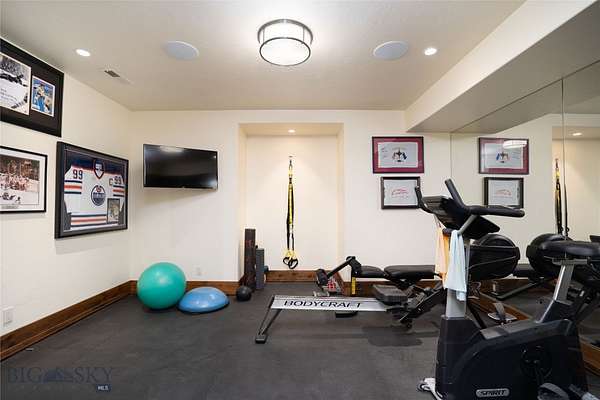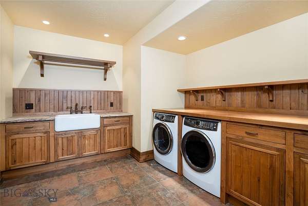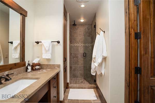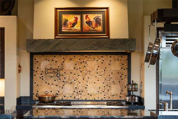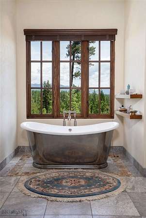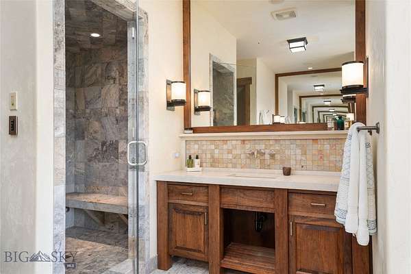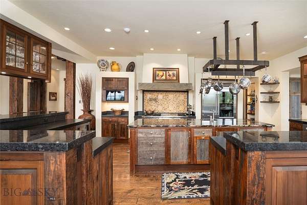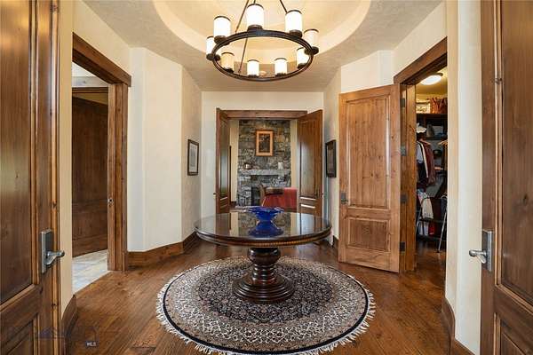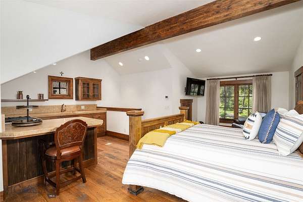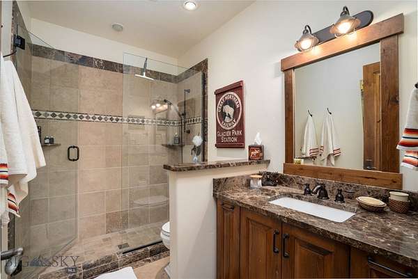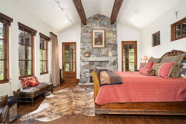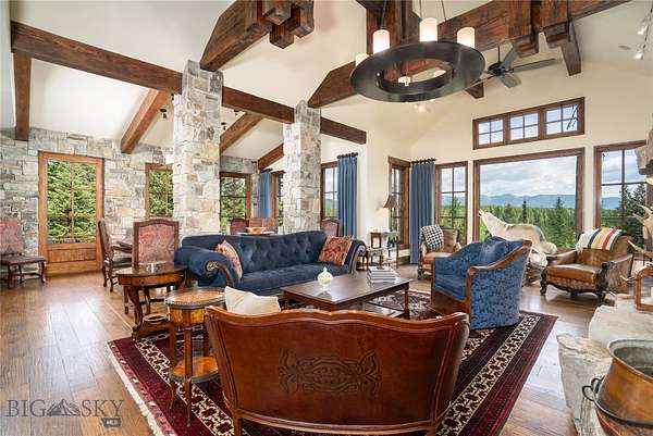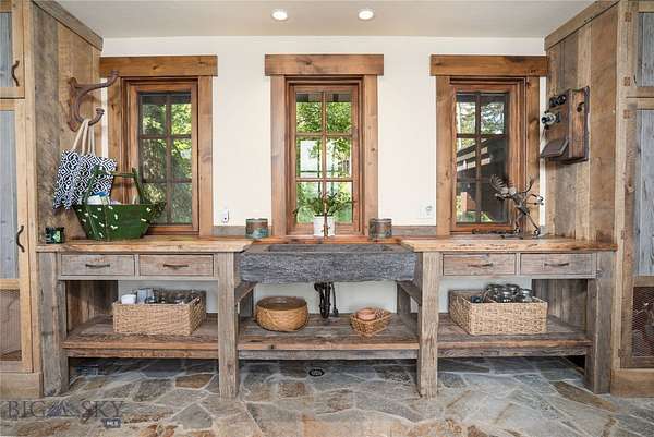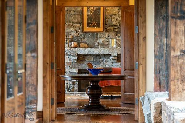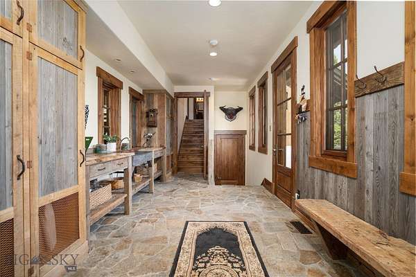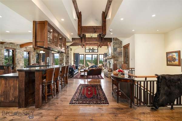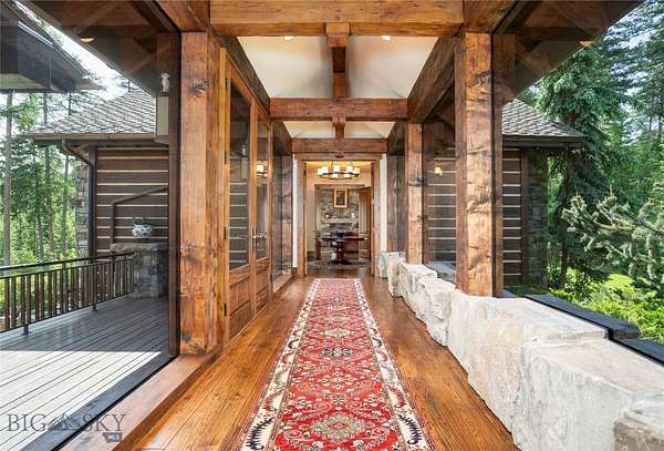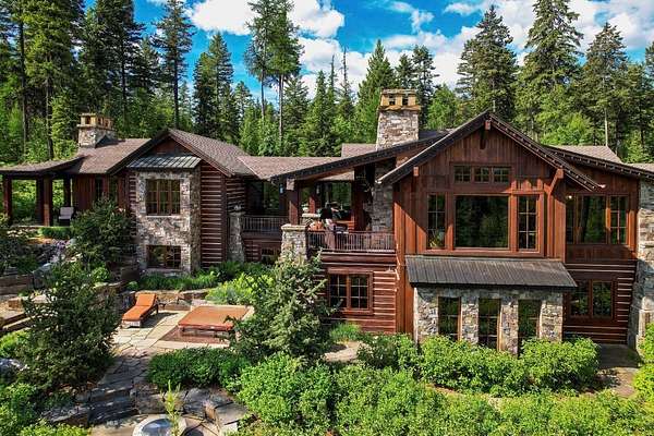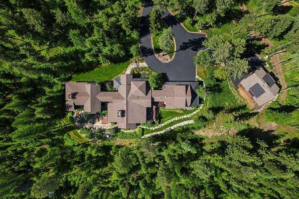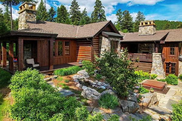 Located within the gated privacy of Whitefish Hills, 1263 Spencer Ridge takes full advantage of one of the best 20 acre lots in the development with views of the Whitefish & Swan Mountain Ranges and stunning views into Glacier National Park and Mt. Jackson. These views are celebrated from virtually every room in this timeless Montana residence of stone, timber and wood handcrafted around a thoughtful and efficient home design to a level of detail rarely experienced. This meticulously maintained home, shop & guest quarters, totaling 8405 SF of finished living space, is blended into the hillside and lives seamlessly with the outdoors from various decks and stone patios surrounded by mature landscaping, terraced gardens and a water feature whispering falling water to the private primary bedroom wing. A series of connected trails makes it easy to venture farther from the home to enjoy the acres of thinned and professionally maintained forest and the serene shore of a shared lily pond below the home. Upon entry from stone steps set under massive timber trusses the home welcomes you with a feeling of warmth and comfort exuded from colors, textures and materials blended in a style of refined Montana rustic. Plaster walls, stained alder trim and doors, sturdy bronze hardware, wood burning stone fireplaces and distressed hardwood floors set the tone while being complimented by top of the line plumbing and light fixtures, appliances, cabinetry and stone countertops. The additional comforts of radiant heat flooring, central air conditioning, audio and controlled lighting systems round out the amenities of a truly custom home experience. From the main entry foyer the home flows into a comfortable open concert of great room, dining area, kitchen and sit up bar all accessing outdoor decks. An incredibly private main floor primary bedroom wing is connected by an impressive glass and stone gallery while the open stairwell makes the transition to the lower level with three additional ensuite bedrooms, family and game room, bar, gym, office, theatre and wine room. Connecting easily from the kitchen, the stone floor mudroom makes the transition to the large three car garage and full guest apartment, while the detached shop located a few steps from the main home adds additional toy storage with more guest quarters above. Complimented by the amenities of Whitefish Hills and shared access to Blanchard Lake this home and location are priced at a true value.
