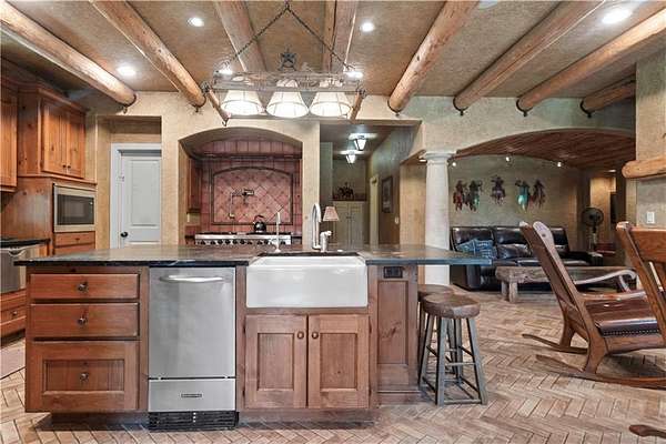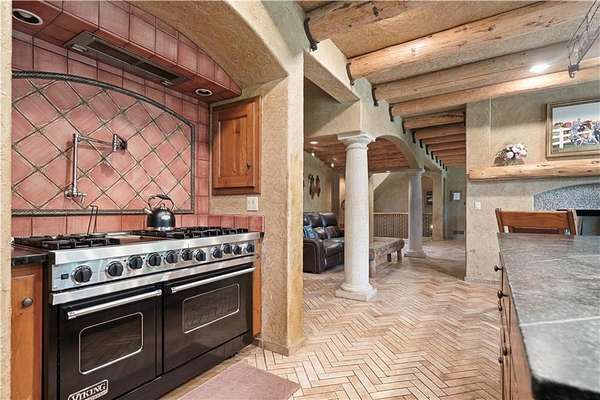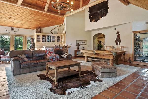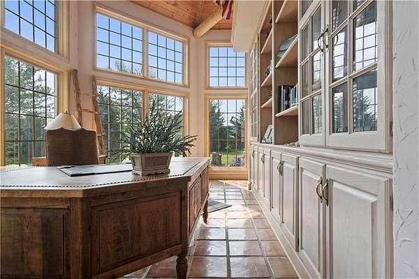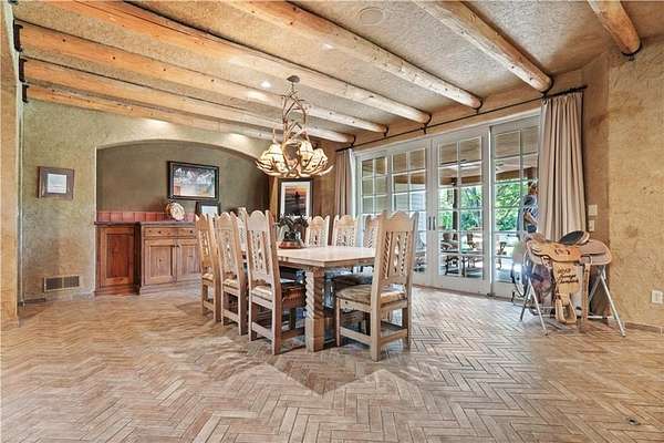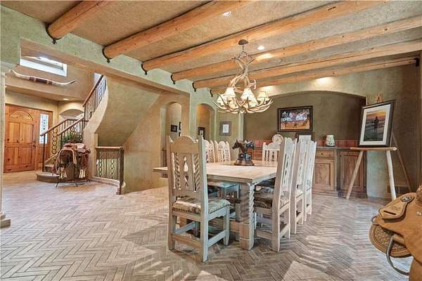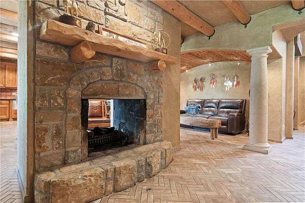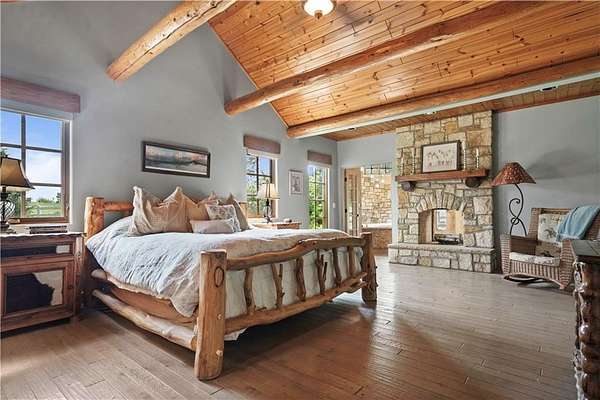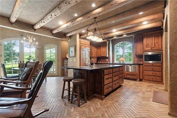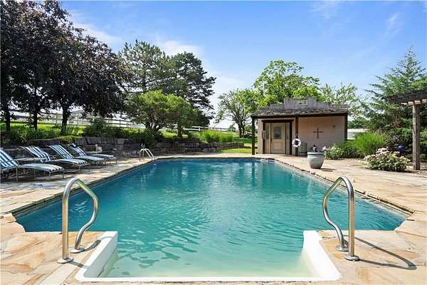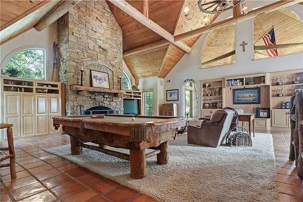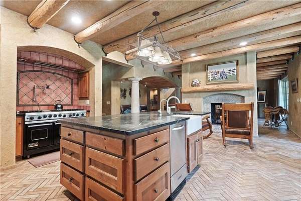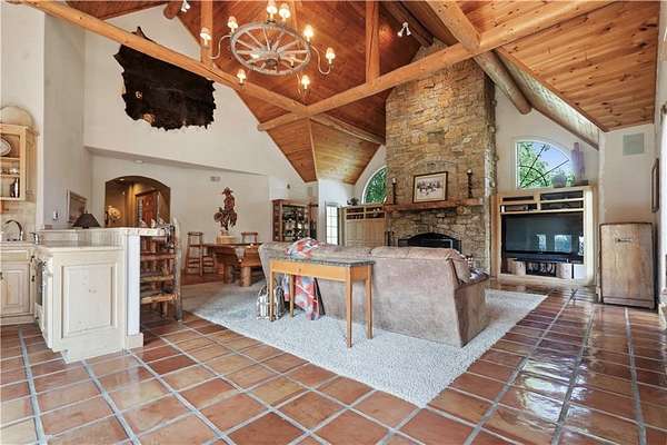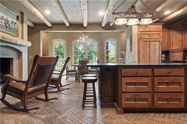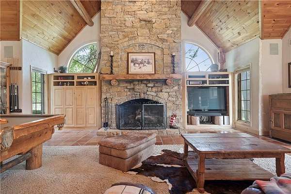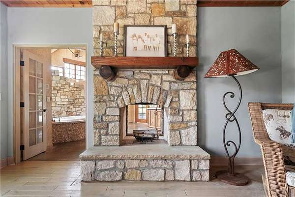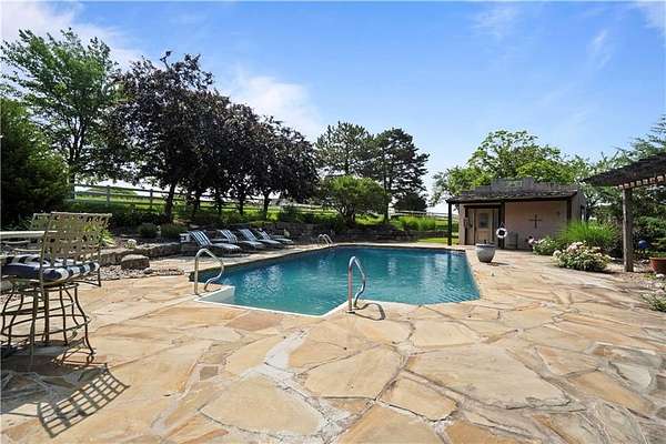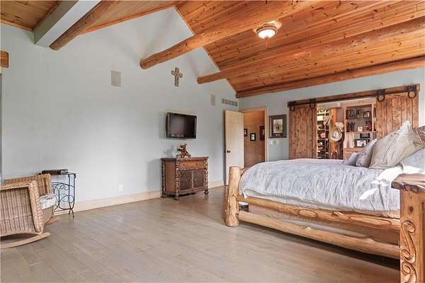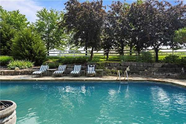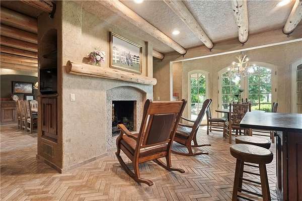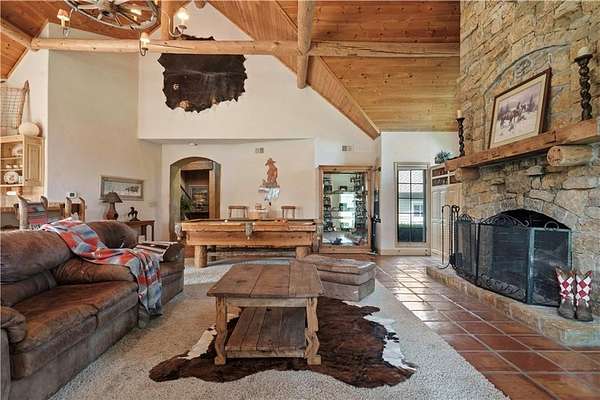 At the heart of the home is a gourmet kitchen designed to impress, featuring a professional-grade Viking gas stove, rich soapstone countertops, custom cabinetry, and a spacious layout perfect for entertaining or everyday living. The stunning great room features soaring two-story beamed ceilings, an impressive floor-to-ceiling stone fireplace, a built-in bar perfect for entertaining, and an adjacent sunroom with a wall of windows that fills the space with natural light and inspiring views. The primary suite is a true sanctuary, complete with a double-sided fireplace, spa-like ensuite bathroom, walk-in shower, and an enormous custom closet built to accommodate the most refined wardrobes. Outside, 10 lush, park-like acres boasts mature landscaping, a sparkling swimming pool, and a serene koi pond--perfect for peaceful mornings or hosting unforgettable gatherings. Equestrian and livestock facilities include three loafing sheds, a tack room, and a riding arena. Whether you're raising horses, cattle, or simply enjoying the open space, this property delivers the perfect blend of comfort and function.