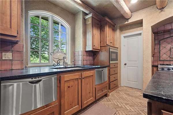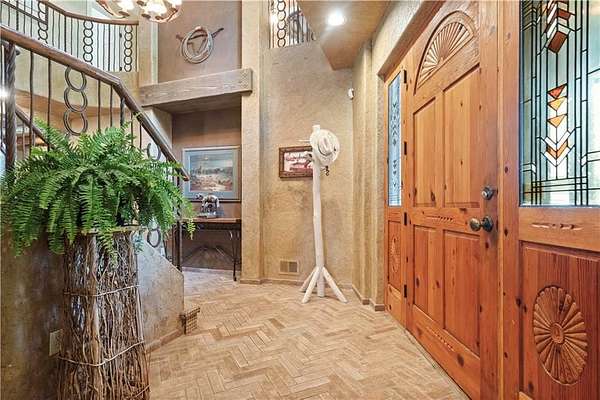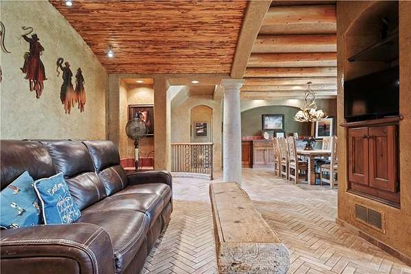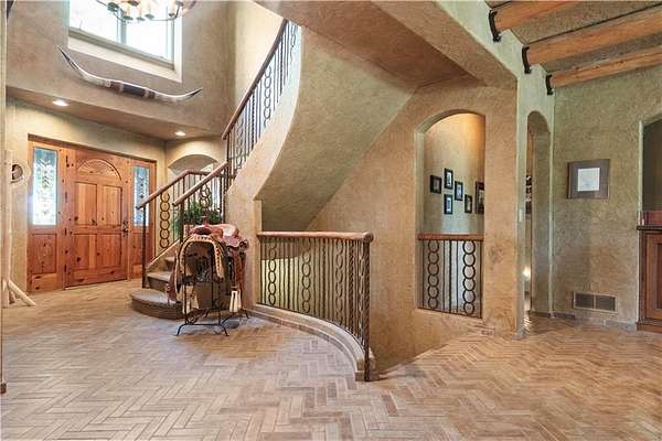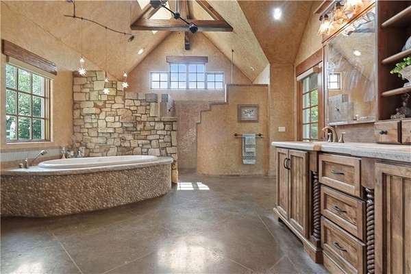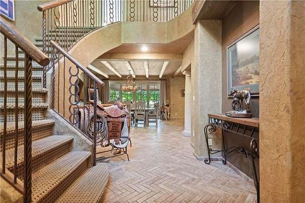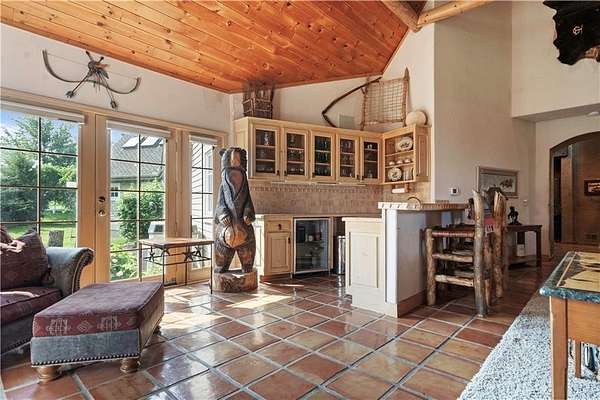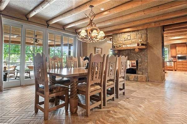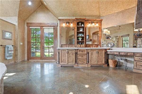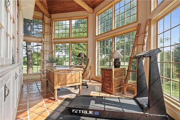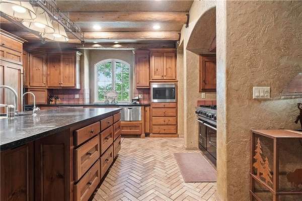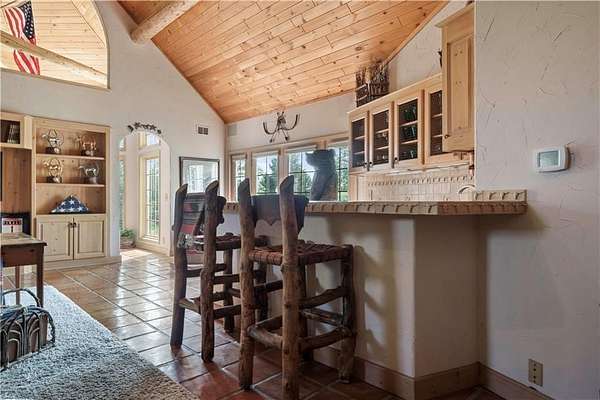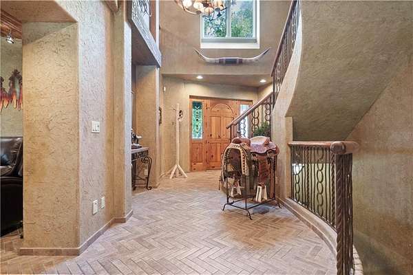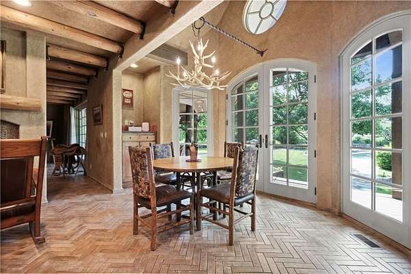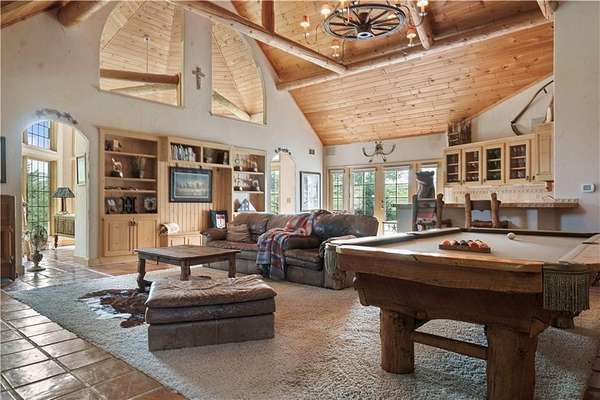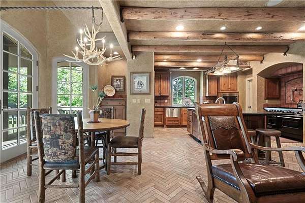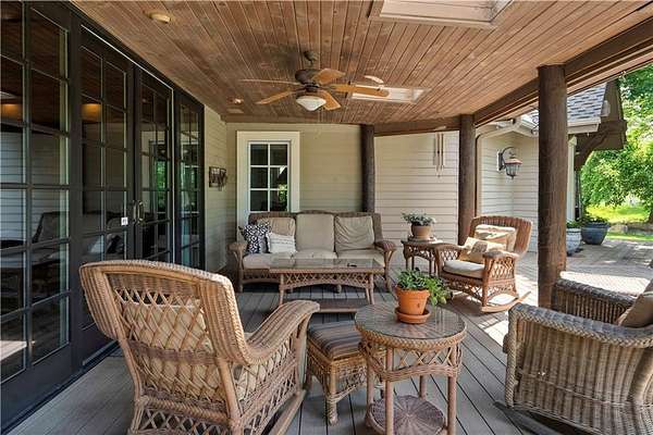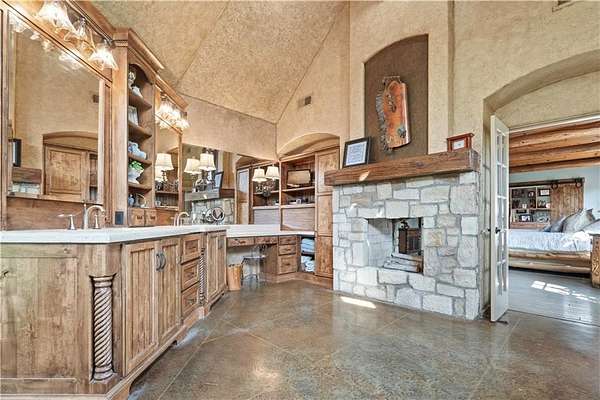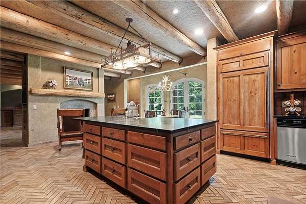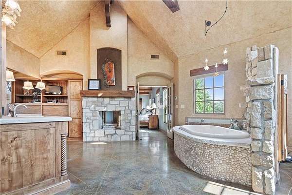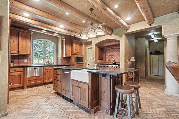 At the heart of the home is a gourmet kitchen designed to impress, featuring a professional-grade Viking gas stove, rich soapstone countertops, custom cabinetry, and a spacious layout perfect for entertaining or everyday living. The stunning great room features soaring two-story beamed ceilings, an impressive floor-to-ceiling stone fireplace, a built-in bar perfect for entertaining, and an adjacent sunroom with a wall of windows that fills the space with natural light and inspiring views. The primary suite is a true sanctuary, complete with a double-sided fireplace, spa-like ensuite bathroom, walk-in shower, and an enormous custom closet built to accommodate the most refined wardrobes. Outside, 10 lush, park-like acres boasts mature landscaping, a sparkling swimming pool, and a serene koi pond--perfect for peaceful mornings or hosting unforgettable gatherings. Equestrian and livestock facilities include three loafing sheds, a tack room, and a riding arena. Whether you're raising horses, cattle, or simply enjoying the open space, this property delivers the perfect blend of comfort and function.