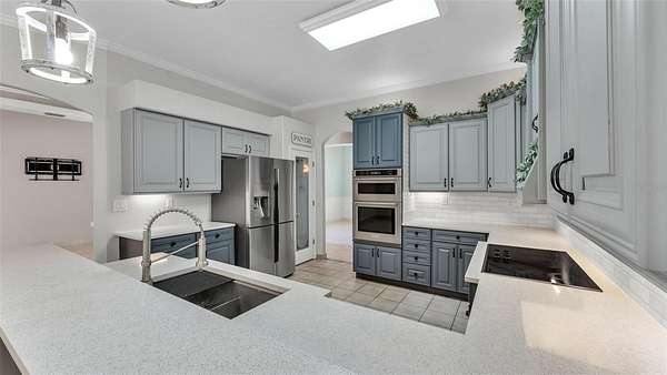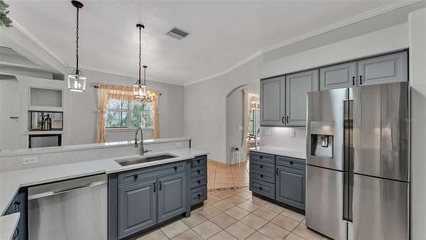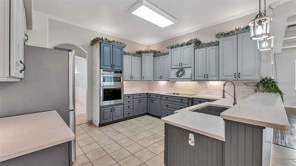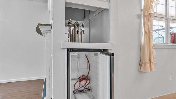 At the heart of the home is a remodeled kitchen (2024) boasting new stone countertops, a touchless faucet, Samsung flex-zone refrigerator, stovetop, dishwasher, microwave/toaster oven combo, and built-in kegerator, making it a true chef's dream.