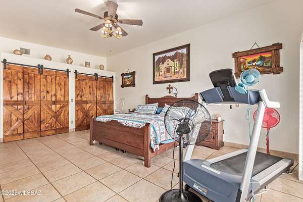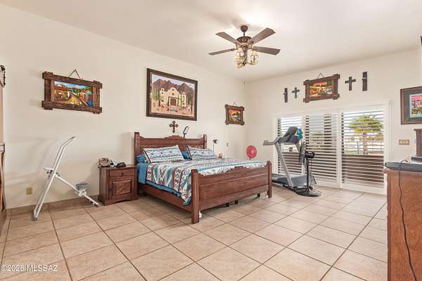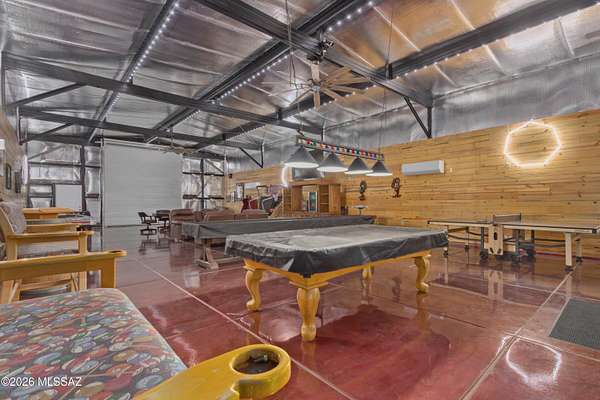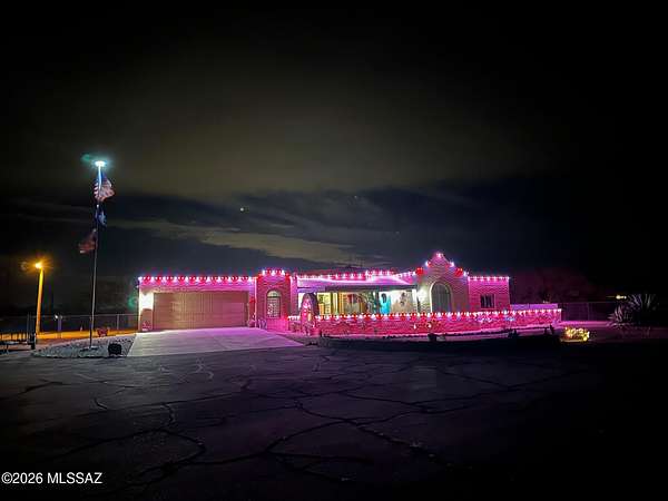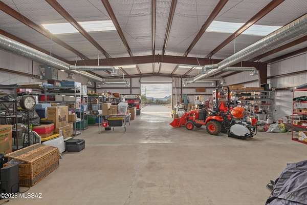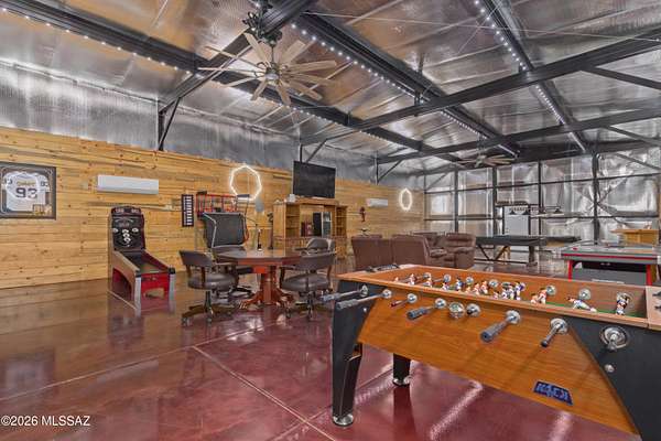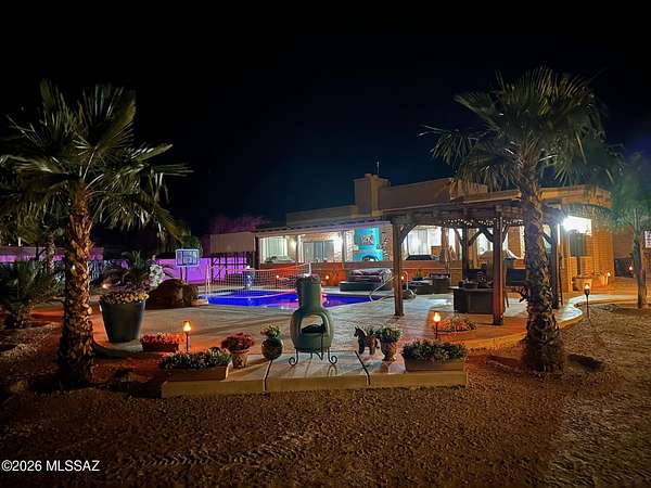 Captivating home on 2 fenced acres w/electric gates. Includes 3800 sf workshop, 1800 sf game room & 765 sf garage. Tile floors & 10 ft ceilings w/skylights throughout. Exposed wood beam ceiling with stone gas fireplace & pellet stove option in family room. Rich wood cabinets, granite countertops & new wood shutters throughout. Master bath with Jaccuzi tub, walk-in shower and large walk-in closet w/mirror sliding doors. Barn door style doors on all bedroom & hall closets. Sliding door access to large rear porch with gas fireplace from master bed & breakfast rooms. Breakfast room features large counter area, cabinets & bar sink. Electric roll down shutters front/back. Pool recently refurbished featuring surrounding palm trees. Amazing sunrise/sunset