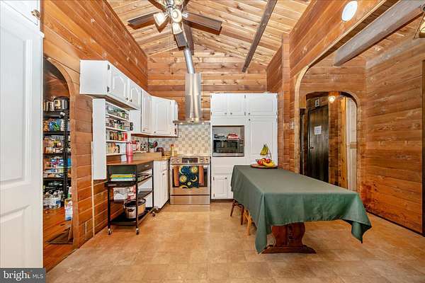 Tucked away on 5.29 private wooded acres in Mount Airy, this truly one-of-a-kind property offers the perfect blend of rustic charm, space, and versatility. This 6-bedroom, 3.5-bath Western Red Cedar cabin with a large traditional-style addition is anything but ordinary. From the moment you step inside, you're greeted by dramatic soaring ceilings, warm cedar finishes, and custom touches throughout. The exterior cabin walls are double-course construction totaling over nine inches thick, providing exceptional insulation and efficiency. The main living level features five bedrooms and 2.5 bathrooms, offering flexibility for family, guests, or home office needs. The kitchen has been updated with newer appliances, making it both functional and inviting for everyday living and entertaining. Major systems have been thoughtfully maintained, with the roof, water heater, heat pump/HVAC all under four years old, giving buyers added peace of mind. The fully finished lower level includes a sixth bedroom, full bath, workshop, living room, kitchenette, and separate laundry area. Registered as an apartment with its own address and private walkout access to an additional parking area, it's ideal for multigenerational living, guest quarters, or potential rental income. Step outside and you'll find even more to love. Two barns add incredible functionality, including one with a finished upper level perfect for gaming, hobbies, or unforgettable sleepovers. Multiple picnic and gathering areas create inviting spaces for entertaining and making memories. The rear three wooded acres are an outdoor enthusiast's dream, featuring established hiking, go-kart, and ATV trails with endless loops, curls, and branches for year-round adventure right in your own backyard. To make maintaining and enjoying the property even easier, a UTV equipped with a plow and leaf sweeper is included with the sale. The home is equipped with an emergency generator, cable TV, internet, and landline service, and the gutters have been recently upgraded with a LeafFilter system-meaning no more gutter cleaning. If you've been searching for privacy, character, space, and a property that truly stands apart, this Mount Airy retreat offers a lifestyle that's hard to find and even harder to leave.