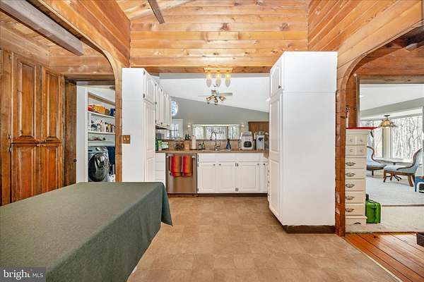 Tucked away on 5.29 private wooded acres in Mount Airy, this truly one-of-a-kind property offers the perfect blend of rustic charm, space, and versatility. This 6-bedroom, 3.5-bath Western Red Cedar cabin with a large traditional-style addition is anything but ordinary. From the moment you step inside, you're greeted by dramatic soaring ceilings, warm cedar finishes, and custom touches throughout. The exterior cabin walls are double-course construction totaling over nine inches thick, providing exceptional insulation and efficiency. The main living level features five bedrooms and 2.5 bathrooms, offering flexibility for family, guests, or home office needs. The kitchen has been updated with newer appliances, making it both functional and inviting for everyday living and entertaining. Major systems have been thoughtfully maintained, with the roof, water heater, heat pump/HVAC all under four years old, giving buyers added peace of mind. The fully finished lower level includes a sixth bedroom, full bath, workshop, living room, kitchenette, and separate laundry area. Registered as an apartment with its own address and private walkout access to an additional parking area, it's ideal for multigenerational living, guest quarters, or potential rental income. Step outside and you'll find even more to love. Two barns add incredible functionality, including one with a finished upper level perfect for gaming, hobbies, or unforgettable sleepovers. Multiple picnic and gathering areas create inviting spaces for entertaining and making memories. The rear three wooded acres are an outdoor enthusiast's dream, featuring established hiking, go-kart, and ATV trails with endless loops, curls, and branches for year-round adventure right in your own backyard. To make maintaining and enjoying the property even easier, a UTV equipped with a plow and leaf sweeper is included with the sale. The home is equipped with an emergency generator, cable TV, internet, and landline service, and the gutters have been recently upgraded with a LeafFilter system-meaning no more gutter cleaning. If you've been searching for privacy, character, space, and a property that truly stands apart, this Mount Airy retreat offers a lifestyle that's hard to find and even harder to leave.