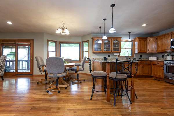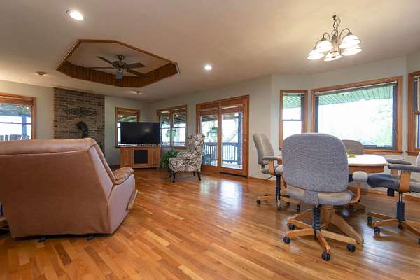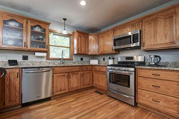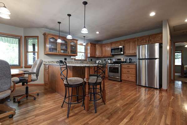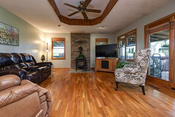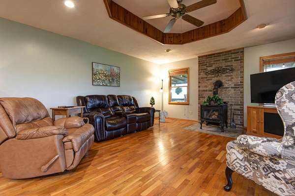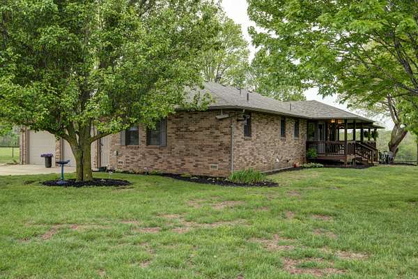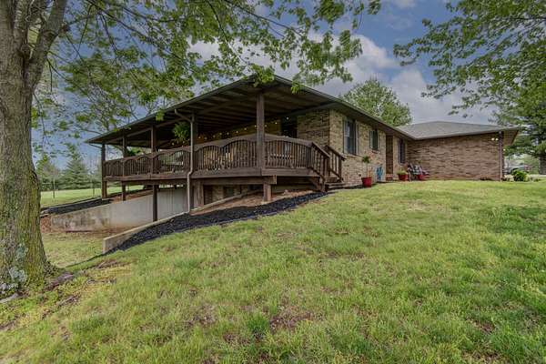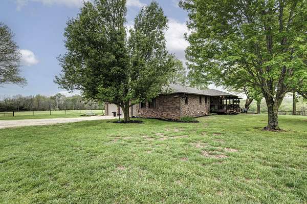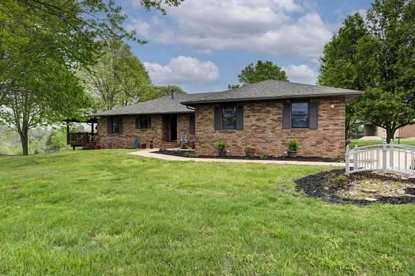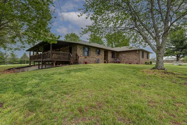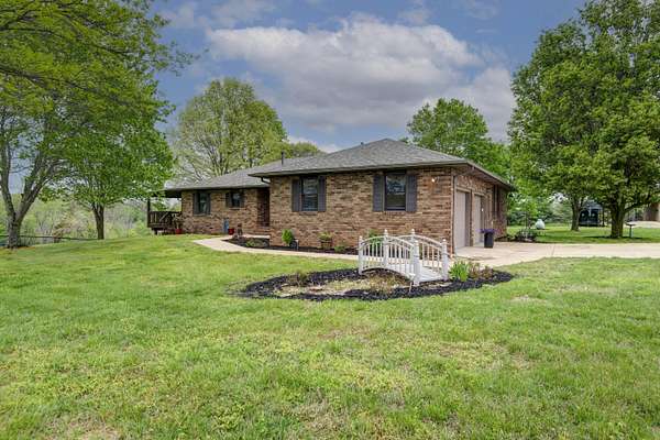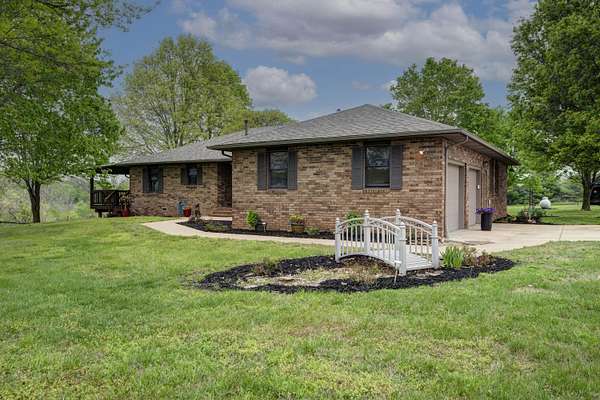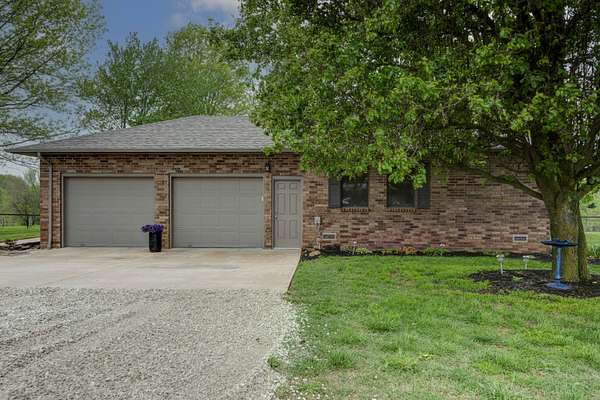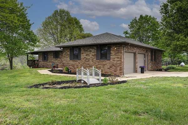 COUNTRY LIVING AT IT'S BEST! This all brick, walkout basement home sits on a picturesque 5 acres with beautiful views out each window! Updates include: new roof in 2025 & garage door openers. It offers 3 bedrooms with a split bedroom floor plan, open concept hearth room with woodburning stove, lovely hardwood floors, granite countertops, stainless steel appliances & gas stove! The primary bedroom is spacious with walk-in closet & walk-in shower! The mud room & separate laundry room are a real plus. The partial unfinished basement has the potential for more finished square footage as well as storage! You'll love coming home to the wonderful wrap around covered deck with gorgeous panoramic views & spectacular sunsets! This wonderful property is fenced and cross fenced with 2 automatic waterers, a 30'x30' barn, 30'x24' barn and 2 lean-tos. One stall has concrete walls half way up. Just 5 miles north of I-44 off of Glenstone (H Hwy) and located in Pleasant View/Hillcrest School District.