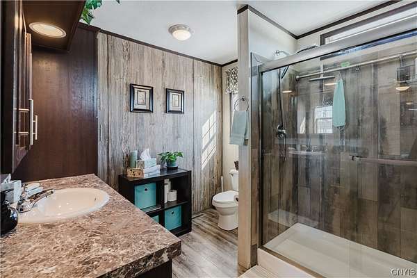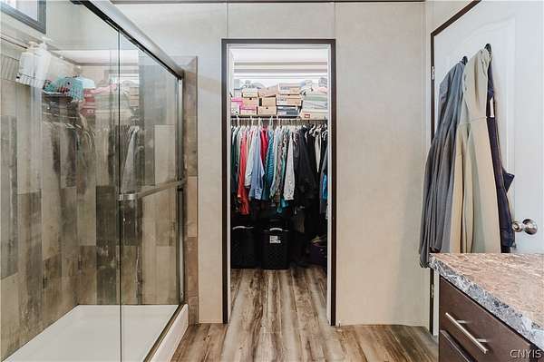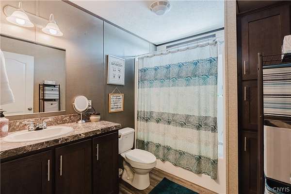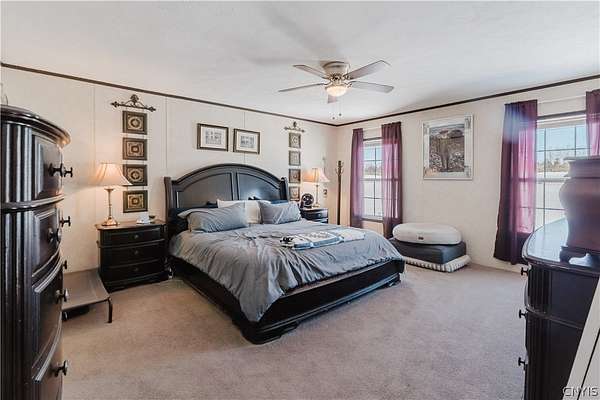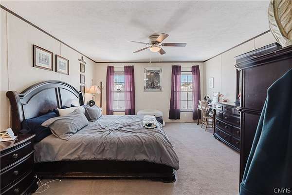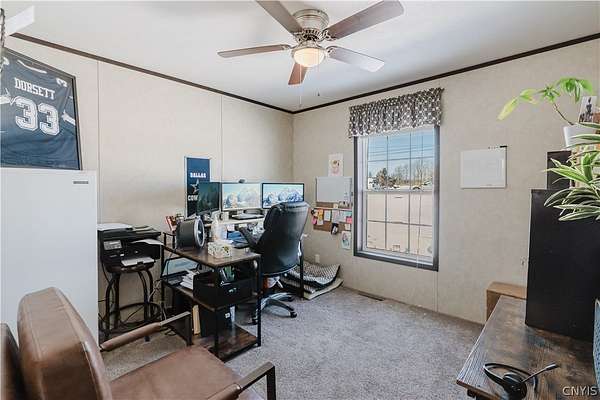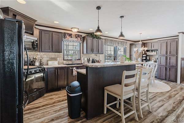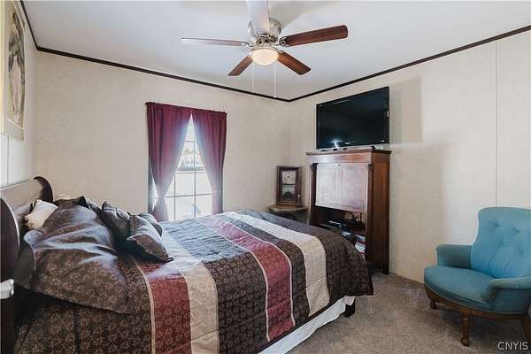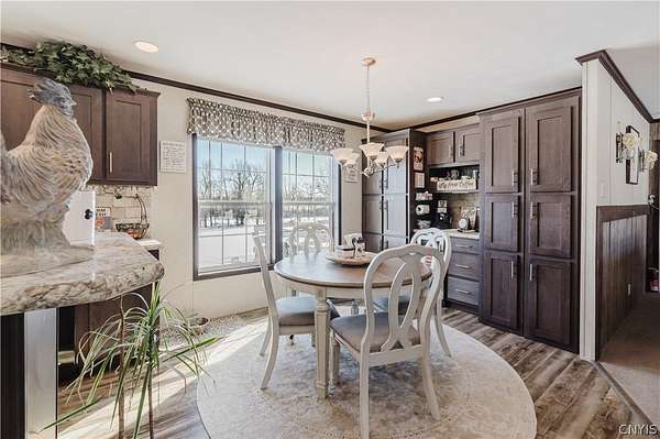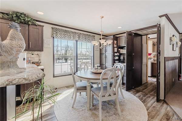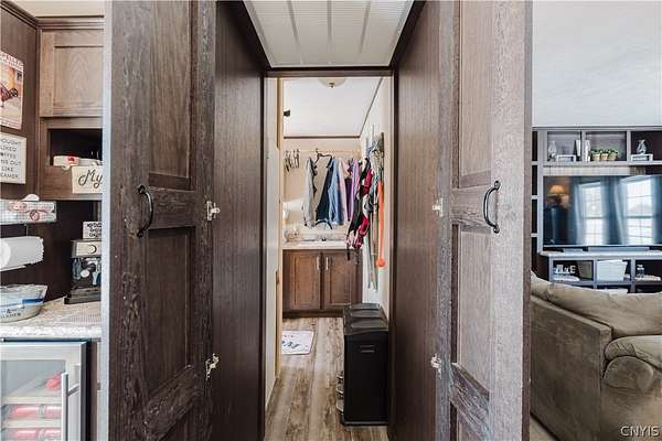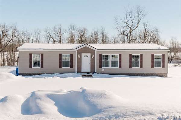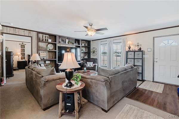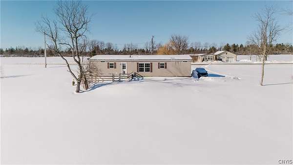 Welcome to this immaculately maintained 3-bedroom, 2-bath manufactured home set in a peaceful country setting just minutes from Chaumont and Clayton. Thoughtfully designed and move-in ready, this home offers comfort, style, and space both inside and out. The spacious open-concept living and dining area is bright and welcoming, featuring custom built-in shelving and an impressive entertainment setup. The thoughtfully designed kitchen includes a modern layered island, wine bar, coffee bar, and side pantry-perfect for everyday living and entertaining. The primary bedroom suite is exceptionally spacious and tidy, complete with a stylishly updated en suite bathroom and a large walk-in closet. A unique hidden door provides seamless access to the laundry room from the center of the home, cleverly disguised as a pantry for both convenience and charm. Secondary bedrooms are in excellent condition, and carpets, flooring, and walls throughout the home are cosmetically very well maintained. Recent updates include a new roof in 2025. Mechanical systems are located in the laundry room and have been well cared for, including the furnace, electric hot water system, water filtration, and chlorine system. The backyard is expansive and enjoyable, bordered by a creek, offering privacy and natural beauty. A recently build fenced in area adds easy accommodation for dogs of any kind. An accessible, classy, and efficiently designed home located in a quiet rural setting, yet conveniently close to Chaumont and Clayton. Call today to schedule your private showing!