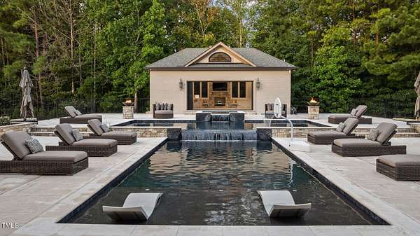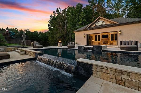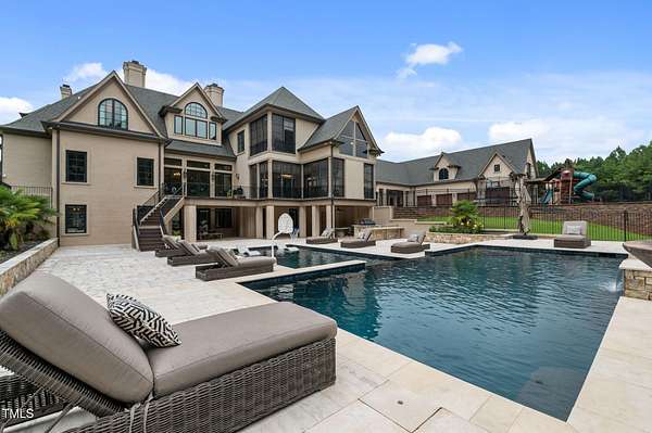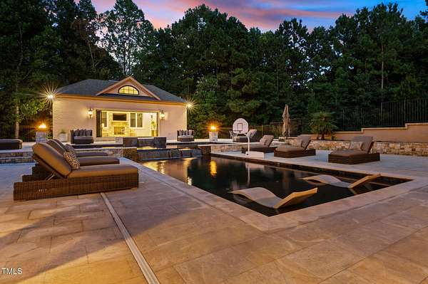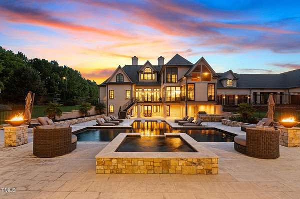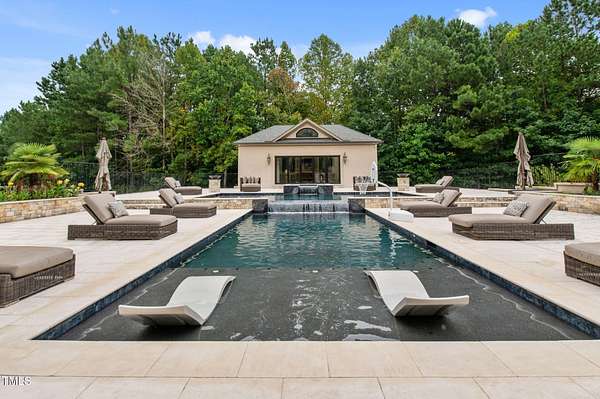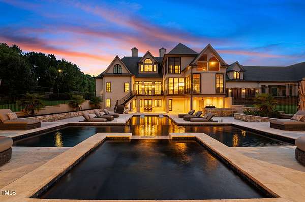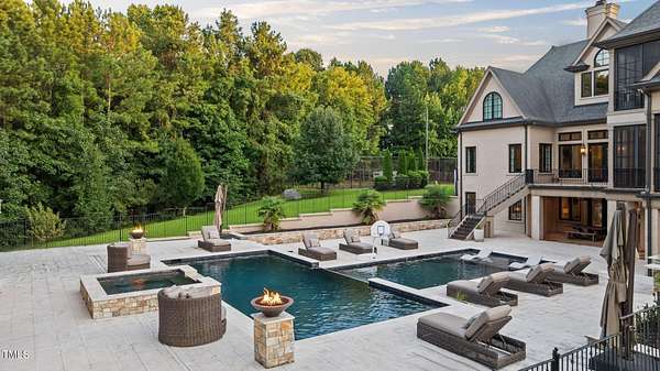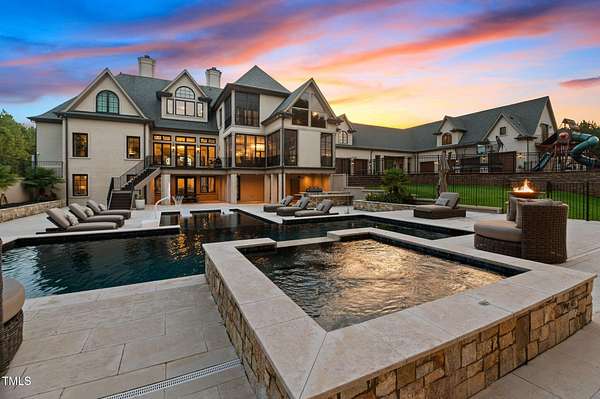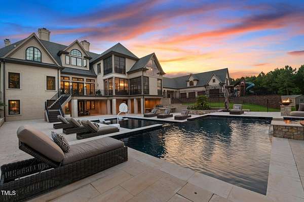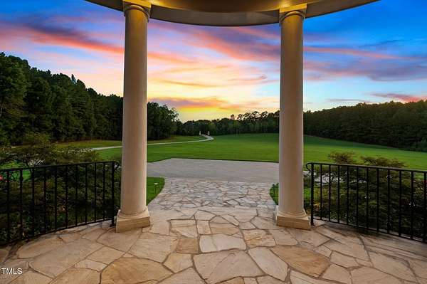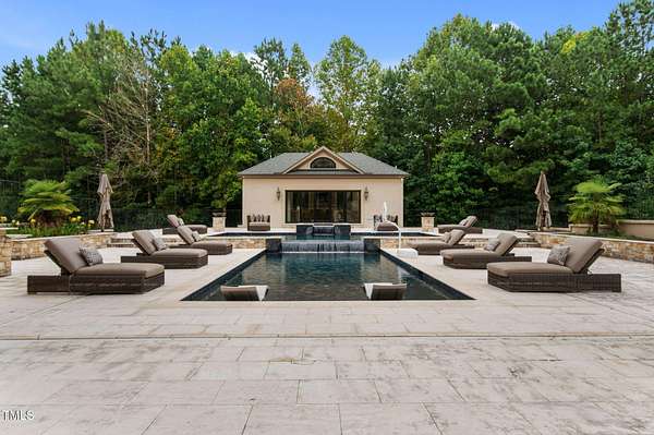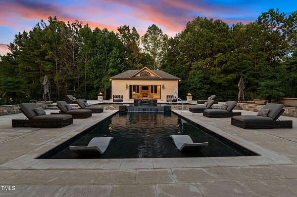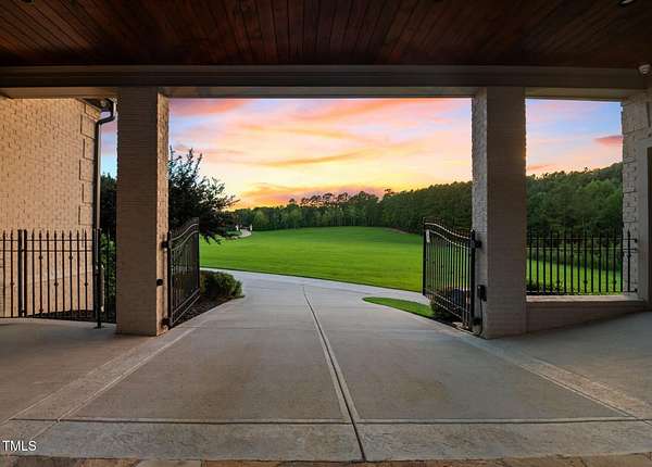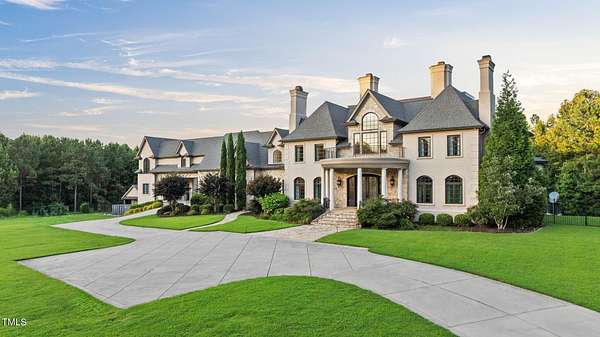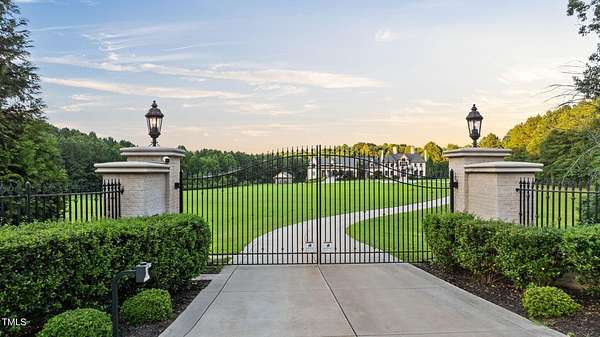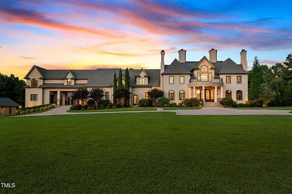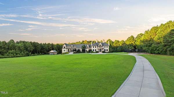 Unparalleled luxury, privacy, and function converge on this extraordinary 14.22-acre estate just north of Falls Lake. Fully fenced and gated for total seclusion, yet minutes from RTP, RDU, top universities, and fine dining. Extensively renovated with high-end finishes and designer details, this home blends modern elegance with timeless design-featuring a grand floating spiral staircase, 11 garages, and state-of-the-art systems including, generator, and reverse osmosis water filtration. The gourmet kitchen impresses with custom cabinetry, an oversized island, and adjoining hearth room, opening to a four-season porch with fireplace-perfect for year-round entertaining. The lavish primary suite offers a private sitting room with fireplace, four-season balcony, home office, laundry, and incredibly expansive his-and-hers private boutique dressing room that showcases custom cabinetry lining the walls, open shelving, soft-close drawers, dedicated hanging spaces and a large island with marble countertops. Elegant designer lighting, including recessed fixtures and statement chandeliers, highlights every detail and adds a warm inviting glow. The sitting area creates a comfortable space to relax or plan outfits. A private entry guest/in-law/Au Pair suite is accessible from the interior and exterior of the home. In the basement, enjoy a full home theater, gaming area, gym with sauna, salon, kitchenette, and bedroom with private bath. Outdoor living is next level: a heated, multi-tier saltwater pool with limestone deck, elevated spa, and waterfalls; a pool house with fireplace and kitchenette; a full basketball court; greenhouse; outdoor kitchen with built-in grill and cooler; temperature-controlled 6-bay kennel with wash station; playground; uplighting; and even a helicopter landing area. Opportunities like this are rare-schedule your private tour today to experience the lifestyle this extraordinary property offers.