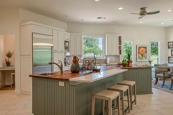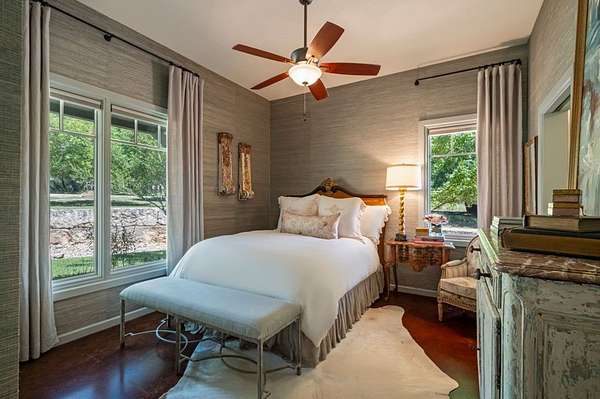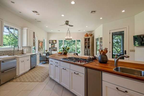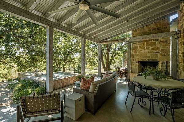 WHERE DISTINCTION MEETS OPPORTUNITY. Just minutes from the heart of Fredericksburg yet worlds away in privacy, this 12.08 acre estate is a rare blend of Hill Country beauty, exquisite design, and modern convenience. The 3,912 SF residence has been fully remodeled with impeccable attention to detail, creating a home that is both elegant and inviting. From the copper-lined ceiling in the entry and rich stone wall accents to the warm textures of grasscloth wallpaper, every space reflects thoughtful craftsmanship. The gourmet kitchen is a chef's dream, featuring Wolf and Sub-Zero appliances and stylish finishes perfect for entertaining. The home offers 3 spacious bedrooms, 3 luxurious baths, and an additional flex space that could function as a 4th bedroom, gameroom, or den. Outdoor living is equally impressive -- a tranquil patio with a stone fireplace and cascading tiered water feature invites long evenings of relaxation. The land itself provides a serene backdrop with mature trees, a natural spring, and ag-exempt status, while reasonable restrictions allow for hunting. Considerable infrastructure investments add to the property's appeal, including an 1,800 SF shop/barn, two Generac generators, three propane tanks, and a fully paved driveway system. Every element has been designed with care and quality in mind. Beautifully maintained and undeniably special, this estate is a Fredericksburg treasure waiting to be discovered.