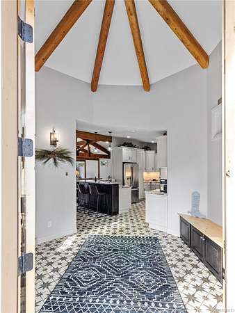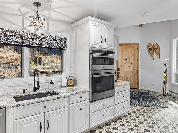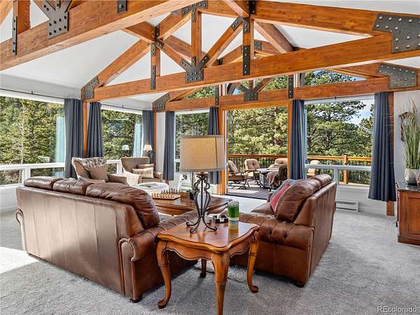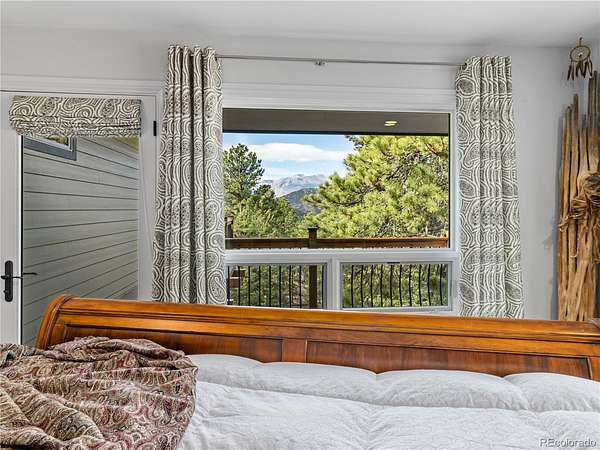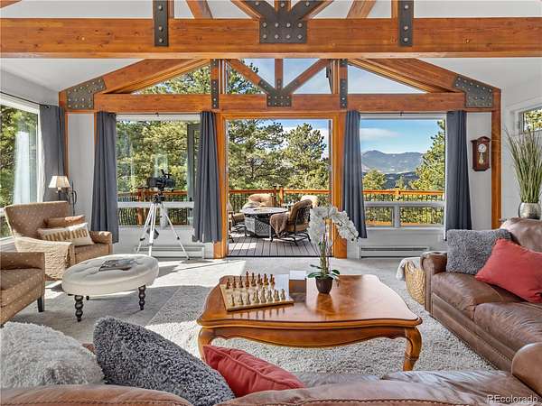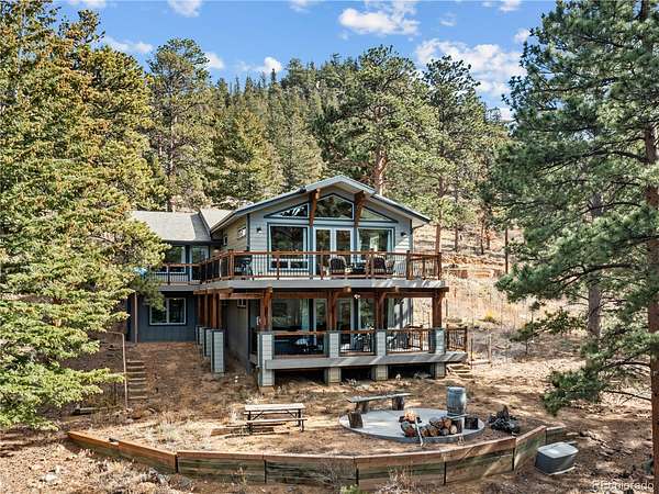 Set high above Estes Park with panoramic mountain views in every direction, this exceptional four-bedroom, three-bath retreat embodies the spirit of Estes itself-rooted in nature, crafted with heart, and designed for comfort in every season. From its architectural turret entry to its mountain-sourced stone fireplaces, the home balances rustic character with refined living and provides main floor living. Inside, a complete interior refresh showcases soft natural light through Pella UV-protected windows. The kitchen pairs GE Cafe and GE Profile appliances with Bianco Antico granite counters, Northern Star designer lighting, and abundant storage for effortless entertaining. Heated floors extend through the kitchen, baths, and hallways, creating quiet warmth year-round. The primary suite invites calm with a soaking tub and mountain views, while two laundry areas add convenience. Energy-smart upgrades include spray-foam insulation, a 50-gallon heat pump water heater, and a 1,000-gallon propane tank for lasting efficiency.Outdoors, nearly twenty acres unfold into open sky and evergreens-your own trailhead for hiking, wildlife, and sunrise views. The wrap-around Trex deck is made for gatherings around the firepit, with space beneath for a future jacuzzi. Hardie Board siding and Korten steel accents stand strong against the alpine elements, while the oversized garage with workshop and built-in dog run add everyday ease. Just minutes from Rocky Mountain National Park, downtown Estes, and Mary's Lake, this is mountain living rooted deeply in place and built with genuine heart.