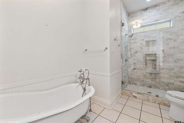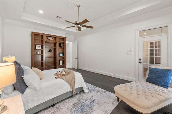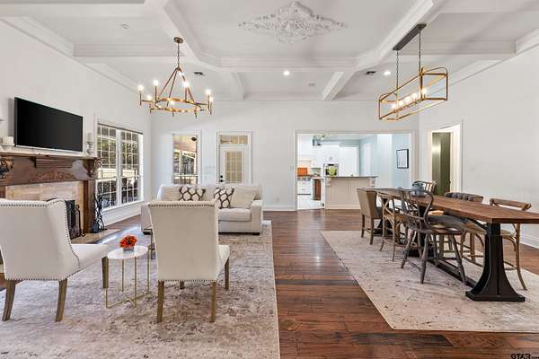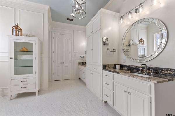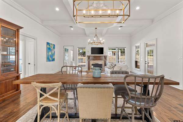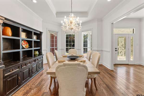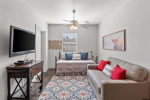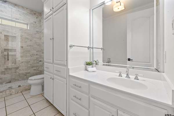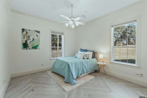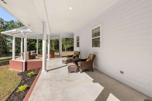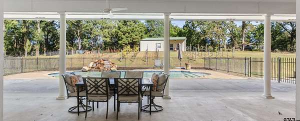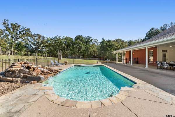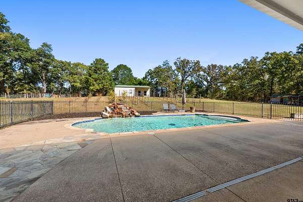 Gated Home on 8 Private Acres - Traditional beauty in the serenity of country living, this stately and inviting house with guest house sits far back off the road and up on a hill, surrounded by partially wooded pasture with a pond and creek running through, and is fully fenced & cross-fenced! The dogs can run and play in the huge fenced side yard while family and friends splash in the pool and waterfall. Feel worlds away as you sit back on the huge covered porches overlooking the natural beauty of the tall pines. Further up the hill, enjoy a separate 1 bed/1 bath/kitchen/living guest house with HUGE game room attached! The 3996, one-story main home layout is thoughtfully planned with 3 bed, 21/2 bath, 2 living areas, split primary suite, and dedicated office featuring expansive floor-to-ceiling custom built-in library with its own separate entrance. The kitchen makes hosting a breeze with 2 islands, Monogram double wall oven, huge gas range, built-in ice machine, farmhouse sink and separate prep sink! Stock up with two large pantries for food storage, a chef's dream! HUGE laundry room with separate sink, folding counter and floor to ceiling custom cabinetry. Property has 2 gates, one is electric that opens to a long driveway and large circle drive for ample parking. Main home Updates include: whole home generator, new roof 2022, bath remodels including onyx semi-precious counter, leathered granite and marble with high-end Brizo fixtures, Ralph Lauren chandeliers in living, while guest rooms, flooring in dedicated office, primary bedroom, guest rooms all updated, and attic space finished for 2nd office! Guest house updates: appliances added, game room added, beautifully finished! Many more updates throughout this property and land! Located just minutes from the medical, shopping and dining of prestigious South Tyler! Call today to schedule your tour of this 8 acre, multi-generational estate! The freeedom of county living just outside city limits is priceless!