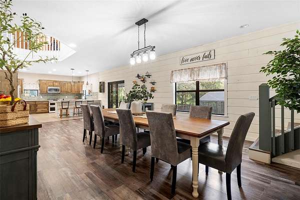 Inside, the main home blends rustic charm with modern comforts--featuring warm wood finishes, spacious living areas, and a layout designed for both relaxation and entertaining. The kitchen is a cook's dream with beautiful walnut stained wood cabinets, wall to wall pantry, quartz countertops with breakfast bar, apron farmhouse sink, and matching GE Cafe Appliances. A CUSTOM 12 foot long Black Walnut dining table serves as the perfect place to entertain guests, host game night, or chat about your day over dinner.