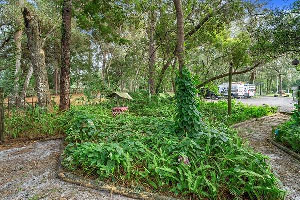 Storage is never an issue here with ample closets, outbuildings, and a large garage for vehicles, equipment, or hobby space. The property is fully fenced with a path to drive the golf cart, the fernery is fully irrigated on well.