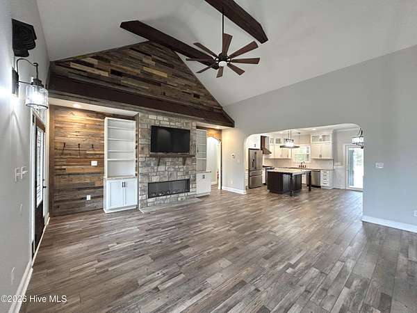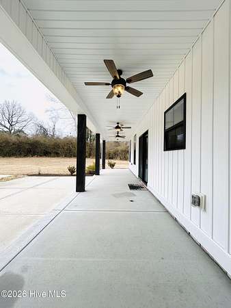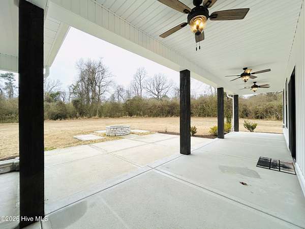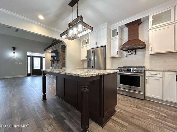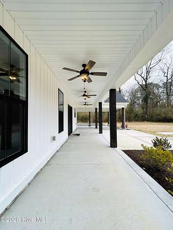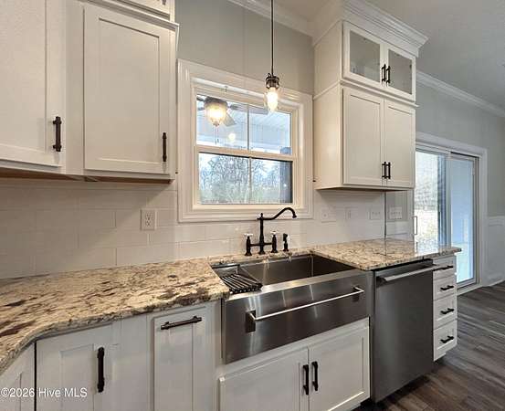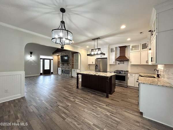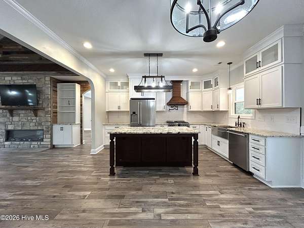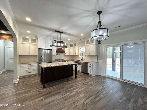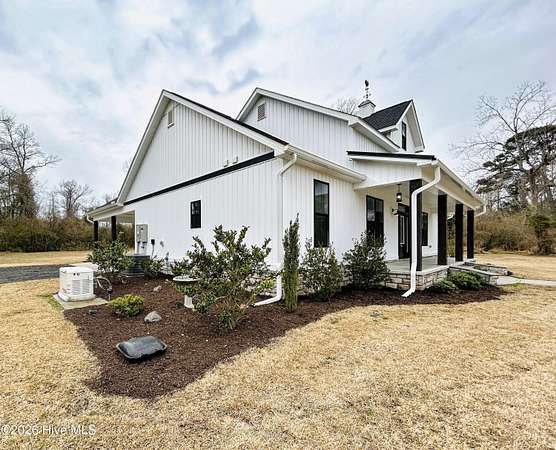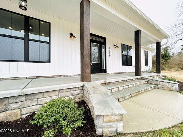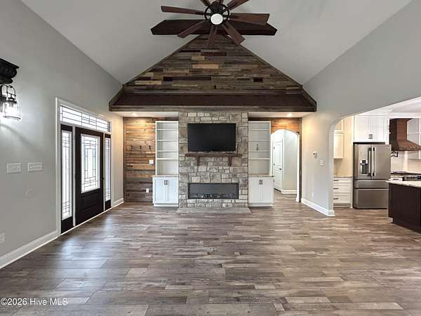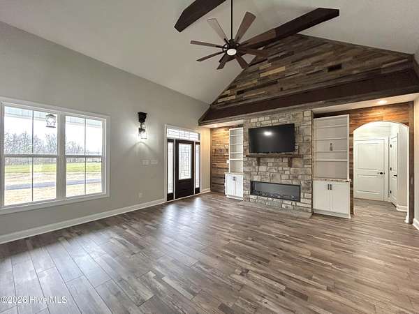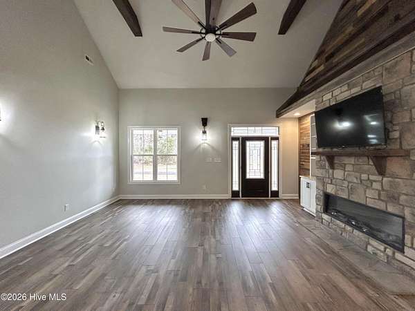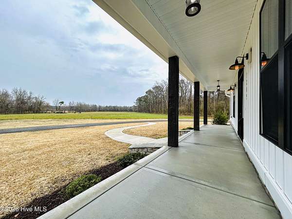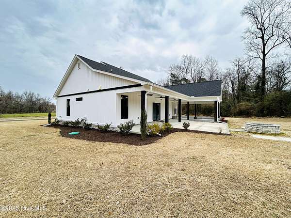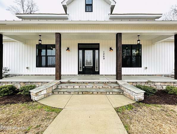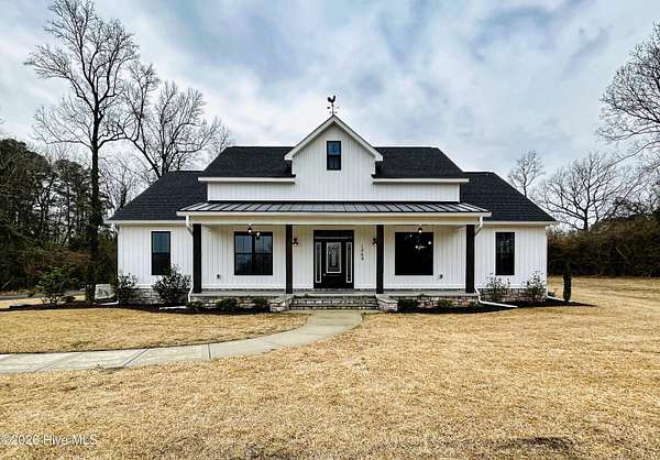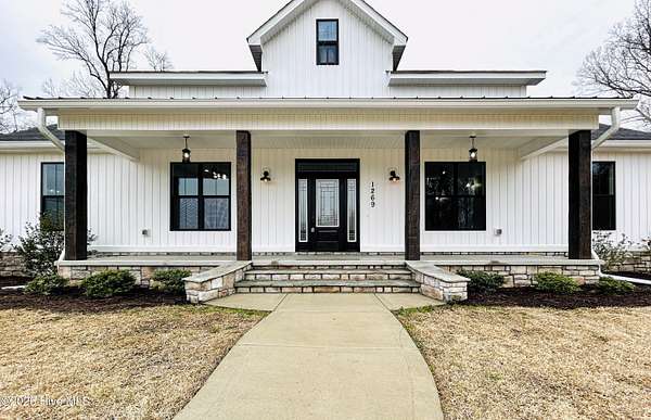 Set on 17 private acres in Duplin County, this nearly new 3-bedroom, 2-bath home offers modern design, quality craftsmanship, and peaceful country living. Luxury vinyl plank flooring runs throughout the home, complemented by upgraded trim work and abundant natural light. The kitchen is a standout, featuring ceiling-height white cabinetry, a decorative hood vent, pot filler over the gas range, and a large furniture-style island-perfect for entertaining and everyday living. The open living area showcases a vaulted ceiling with wood beams, a stone fireplace with built-in shelving, and natural wood shiplap extending to the ceiling, creating a warm and inviting focal point. Two spacious secondary bedrooms with large windows share a stylish hall bath with a farmhouse-style sink and tub/shower combination. The primary suite is a true retreat, offering a generous bedroom, an impressive en suite bath with double vanities, an oversized walk-in tile shower with rainfall shower head, abundant cabinetry, and a large walk-in closet. Additional features include a Rinnai tankless water heater, whole-house Generac generator, and an oversized covered front porch with stonework details, ideal for enjoying the surrounding acreage. A rare opportunity to own a move-in-ready home with exceptional finishes, privacy, and room to roam!