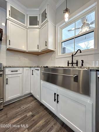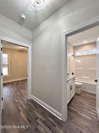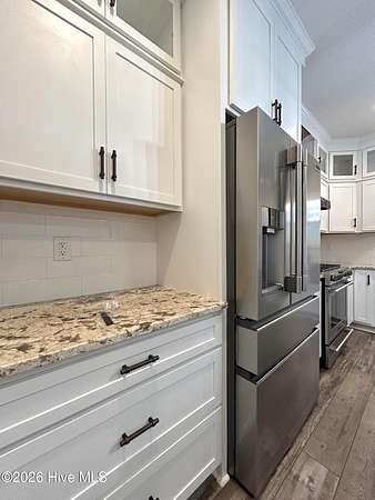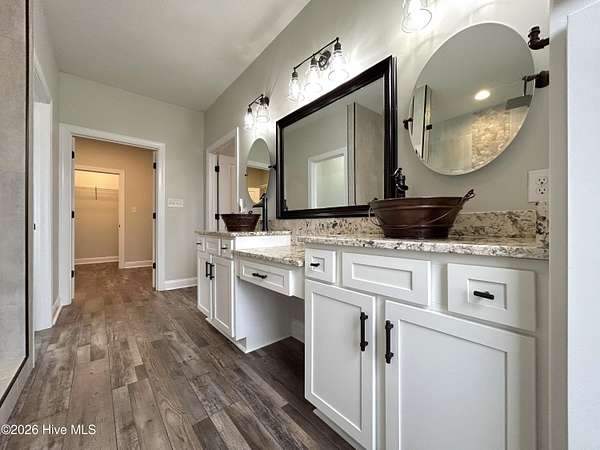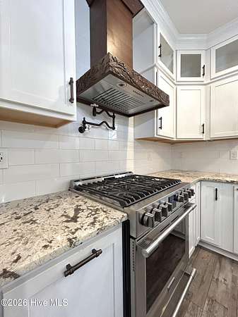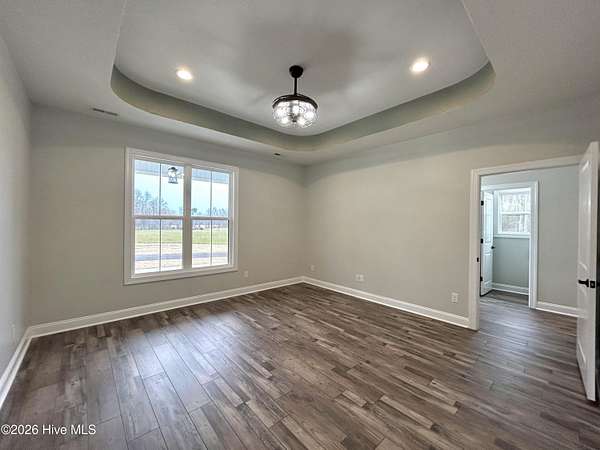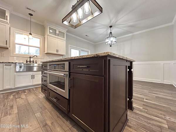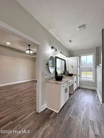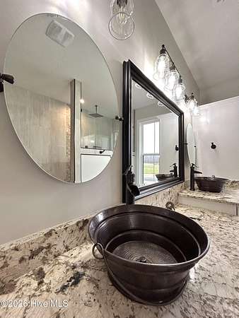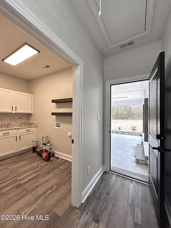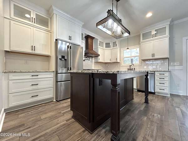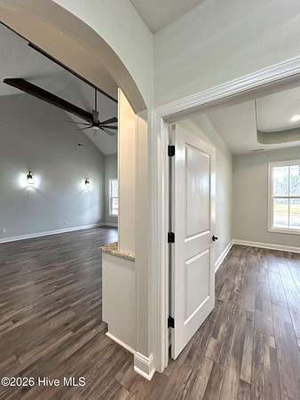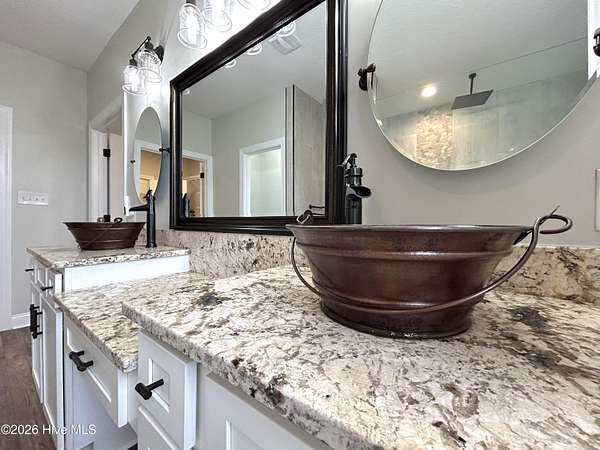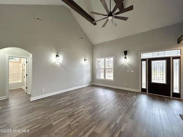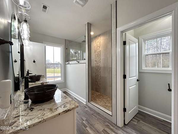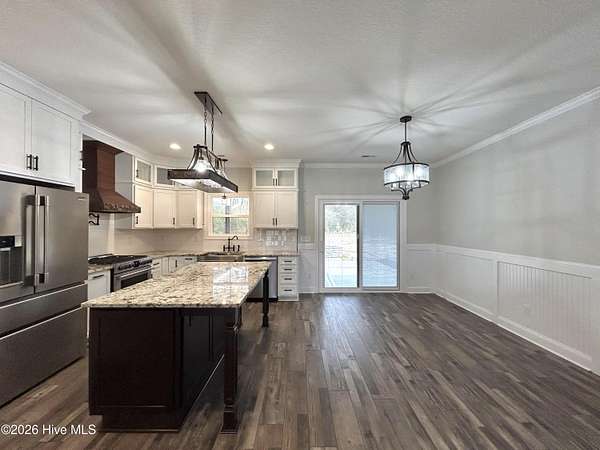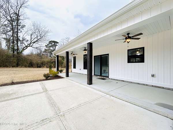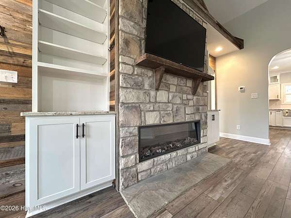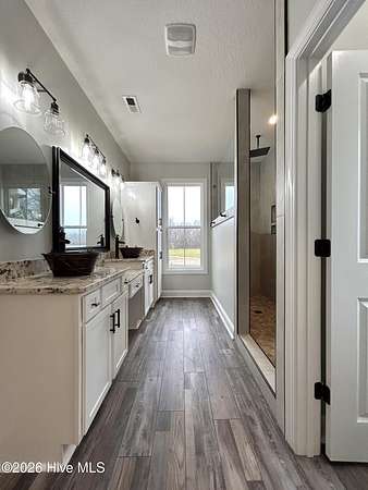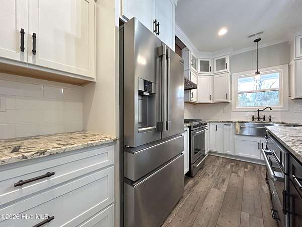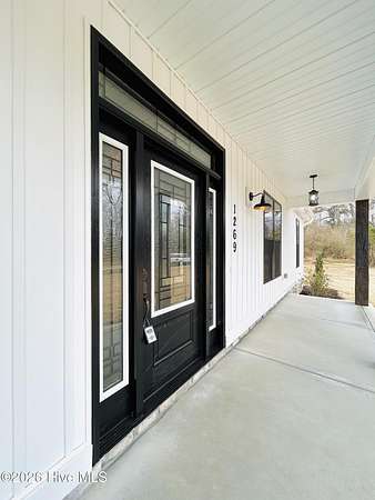 Set on 17 private acres in Duplin County, this nearly new 3-bedroom, 2-bath home offers modern design, quality craftsmanship, and peaceful country living. Luxury vinyl plank flooring runs throughout the home, complemented by upgraded trim work and abundant natural light. The kitchen is a standout, featuring ceiling-height white cabinetry, a decorative hood vent, pot filler over the gas range, and a large furniture-style island-perfect for entertaining and everyday living. The open living area showcases a vaulted ceiling with wood beams, a stone fireplace with built-in shelving, and natural wood shiplap extending to the ceiling, creating a warm and inviting focal point. Two spacious secondary bedrooms with large windows share a stylish hall bath with a farmhouse-style sink and tub/shower combination. The primary suite is a true retreat, offering a generous bedroom, an impressive en suite bath with double vanities, an oversized walk-in tile shower with rainfall shower head, abundant cabinetry, and a large walk-in closet. Additional features include a Rinnai tankless water heater, whole-house Generac generator, and an oversized covered front porch with stonework details, ideal for enjoying the surrounding acreage. A rare opportunity to own a move-in-ready home with exceptional finishes, privacy, and room to roam!