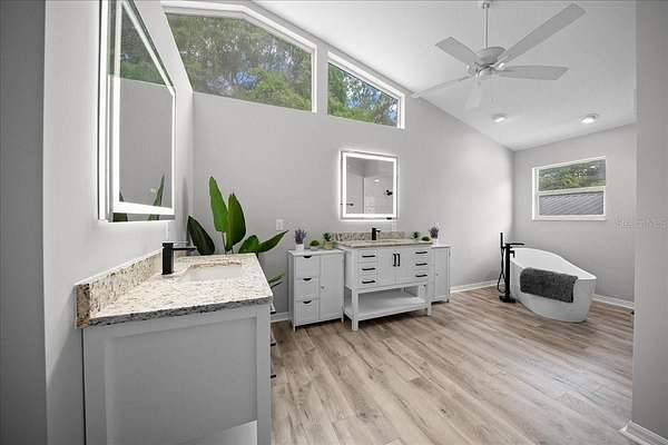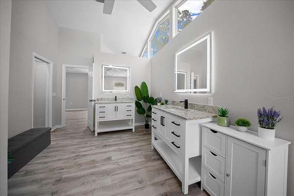 - Cathedral Ceiling(s), Ceiling Fans(s), Eat-In Kitchen, High Ceilings, Kitchen/Family Room Combo, Primary Bedroom Upstairs, Stone Counters, Thermostat, Walk-In Closet(s)