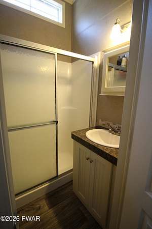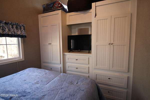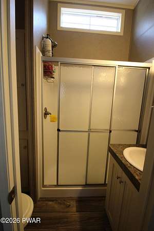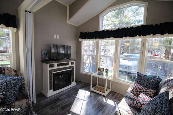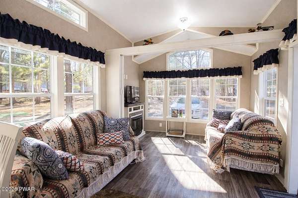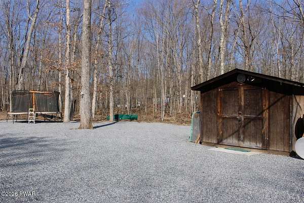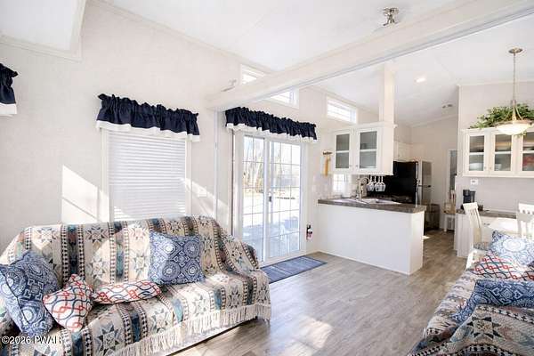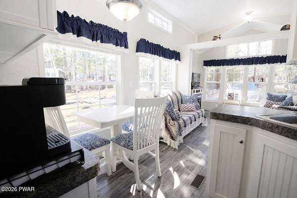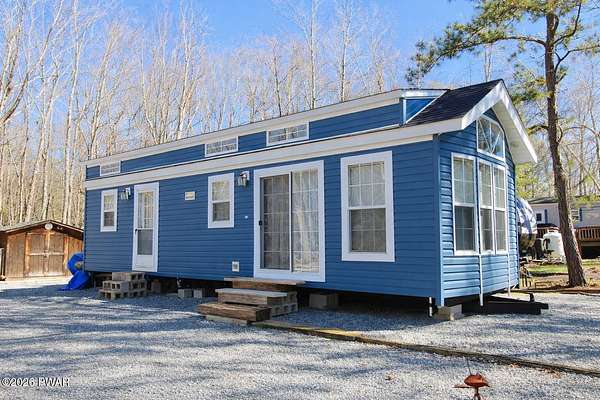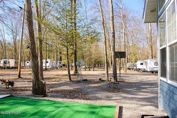 Enjoy privacy and convenience in this Charming Park Model located at 127/129 Birchy Brook Lane in Lake Adventure. This property backs to a peaceful green area and includes a second bonus lot, with a small stream behind, so no one can build directly behind you. The interior offers a warm and inviting feel with custom white wood kitchen cabinets, a 2-person island, and soaring vaulted ceilings. The living room is filled with natural light from a triple window and features an electric fireplace for cozy evenings. Laminate flooring runs through the main living area, while the bedroom is comfortably carpeted and includes built-in dresser drawers and closet space. A spacious bathroom completes the home.The yearly fee covers water, sewer, road maintenance, and electric, and the location is ideal with shopping and interstate access just minutes away.