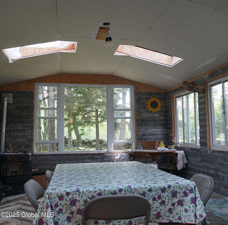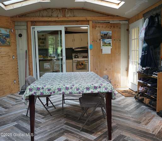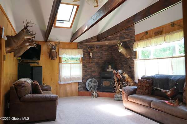Looking for that weekend getaway? or hunting property? or somewhere for hiking? or even a place to ride recreational vehicles? Look no further! This property is perfect for it all! 18.23acres with privacy, open fields, growing apple orchard, hiking and riding trails, hills, stone walls, even a private waterfall! 2 bedroom/1 bath/ 2 car garage,. There is a large living room with cathedral ceilings, wood pellet stove, skylights and accented by the beams. The kitchen has ample storage and cabinet space, its open to the dining area and the family room (in the front of the home) once again cathedral ceilings, skylights & another wood pellet burning stove. tons of storage. Oh,& all the privacy! *The owner has used the property for seasonal use only, and it is winterized every late fal