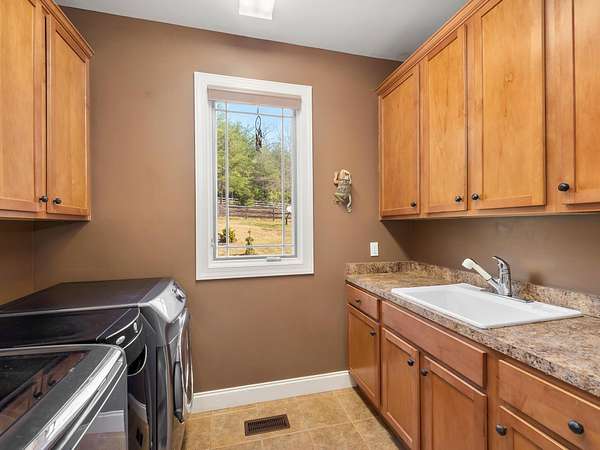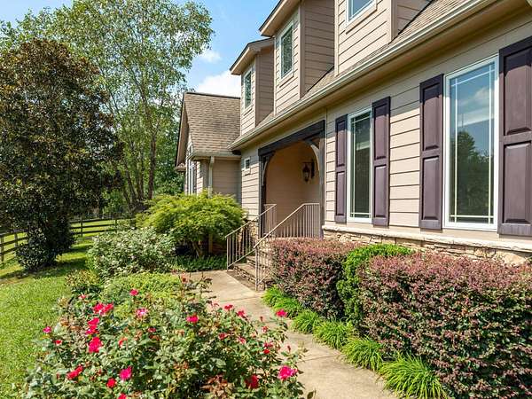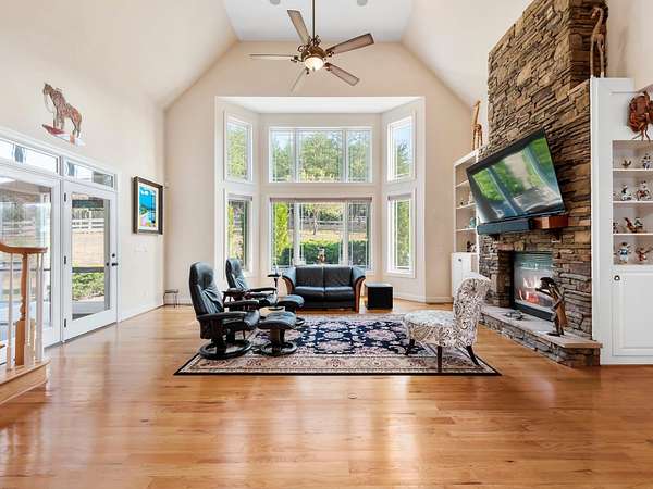 Charming farm on 5.4 acres in Landrum's Gowen's Fort gated community. The main level primary suite features a gas fireplace, dual vanities, jacuzzi tub walk in tile shower, double closets and triple doors leading to a screen lanai -- a serene year-round retreat. Upstairs included two en-suite bedrooms, a dedicated flex/office space and a finished room above the garage --ideal for guests, multi-gen living, remote work, or recreation. An open concept kitchen and living room anchors the home, where smart-enabled appliances deliver real-time alerts directly to the 75" TV. Soaring ceilings and a stunning double sided stone fireplace elevate both the living room and the adjacent dining space. Built-in surround sound throughout the home enriches the atmosphere for entertainment and relaxation. The 4-stall barn includes hay storage, fenced pastures, and a fully independent efficiency apartment with kitchen, full bath, and a private stone patio and fireplace --suitable for guests, caretakers, or income potential. This property offers the perfect set up for up to 4 horses, with direct access to community trails. This home and neighborhood is well-suited for non-equestrians as well. 22 miles to TIEC and 34 miles to GSP