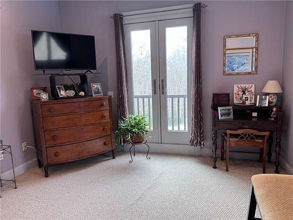 Tucked away at the end of a private lane in sought-after South Tiverton, this striking contemporary colonial offers exceptional privacy with coastal convenience. Set on nearly 5 acres with mature perennials and professional landscaping, the property provides a peaceful, secluded setting. Located between historic Four-Corners & Adamsville, under 10 minutes from Fogland Beach and less than 15 minutes from Grinnell's Beach, enjoy the coastal lifestyle. The home features a two-car garage, large carport, and spacious attic above the garage offering potential for future living space or guest quarters. The main level includes an attractive kitchen with granite countertops and Viking gas cooktop, a cozy living room with wood burning fireplace, a first-floor bedroom or office, and a full bath. Upstairs is a spacious primary suite with private balcony, gas fireplace, walk-in closet, and spa-like bath with tiled shower, soaking tub, and double vanity. The finished lower level offers a large family room or optional third bedroom, ample closets, a utility room with laundry, and excellent storage. A large mahogany wrapped deck with direct plumbed gas BBQ & outdoor shower overlooks the SW exposure fenced garden with raised beds completes this private retreat