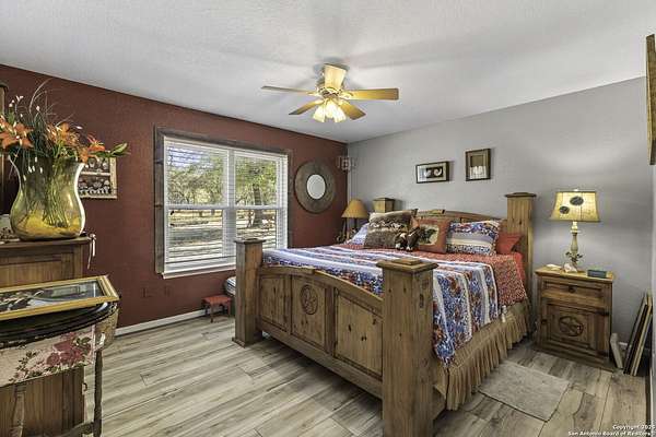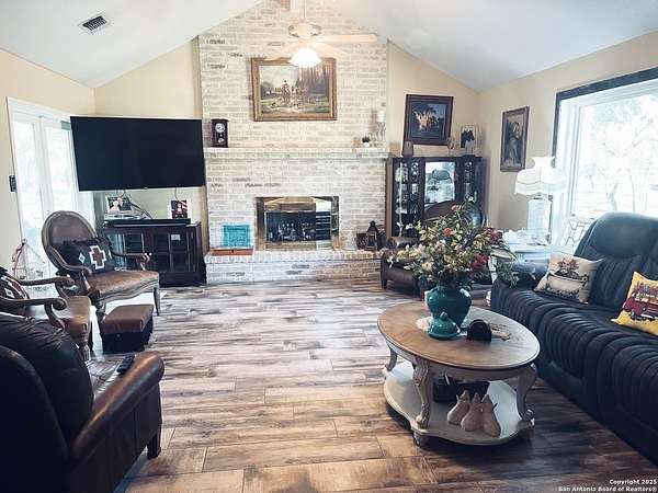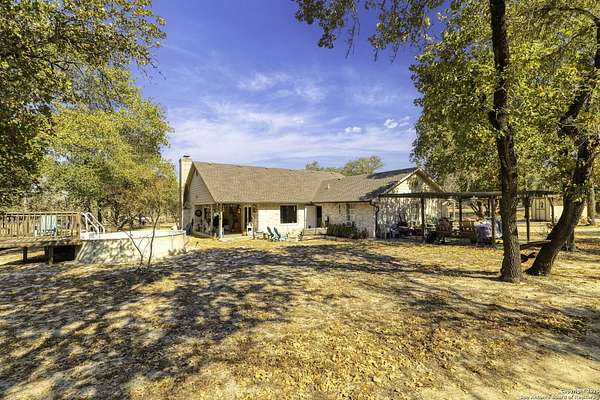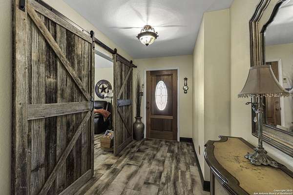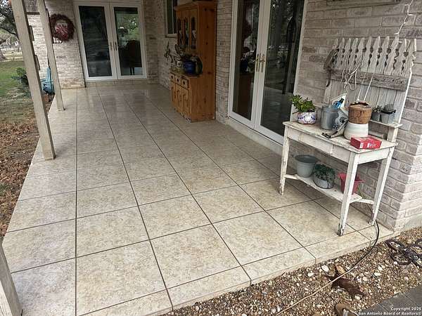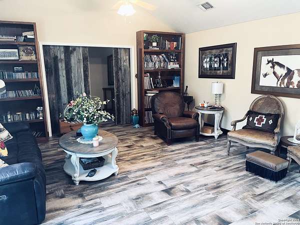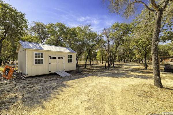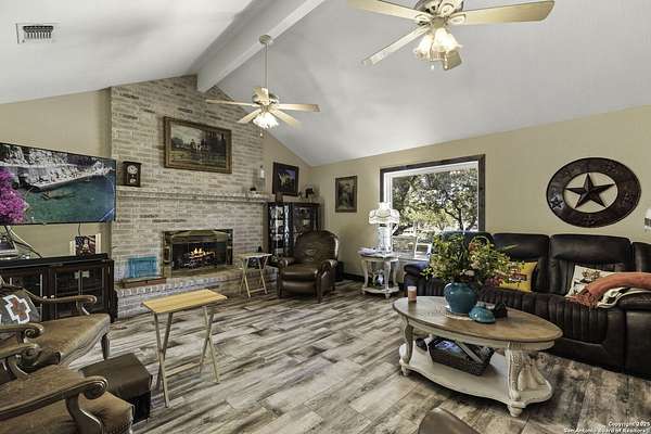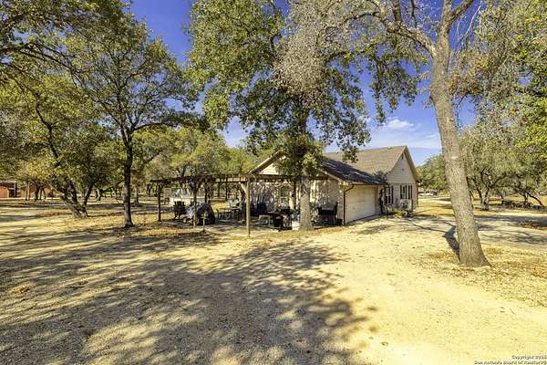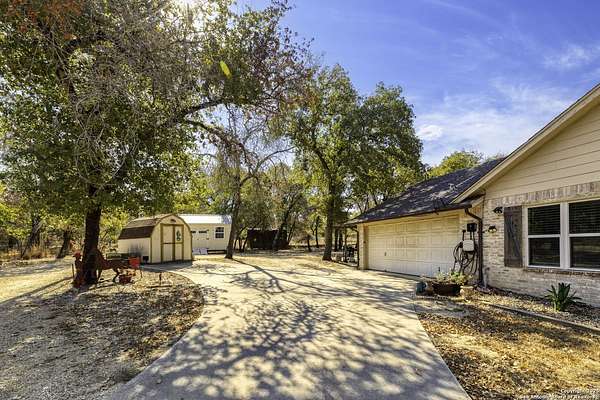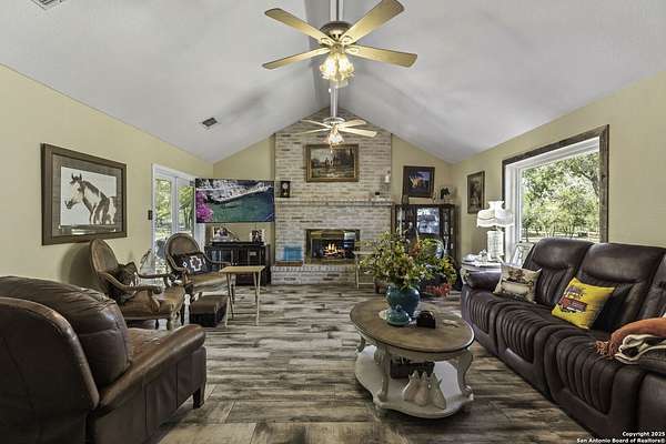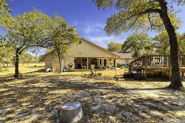 This beautifully updated brick home sits on 3 peaceful acres in Floresville, offering modern comfort with the serenity of country living. The spacious family room features a stunning brick fireplace and flows into a bright, open layout highlighted by elegant porcelain floors and granite countertops. Recent upgrades include a new roof in 2023, energy-efficient windows and doors, and a premium A/C system for year-round comfort. The primary suite has been thoughtfully enhanced, with a portion of the second bedroom converted into an oversized custom closet, creating two true walk-in closets for exceptional storage and functionality. Outside, the property is fully fenced with a private gated entrance, circle drive, and attached garage for easy access. A 14x24 outbuilding provides ample space for a workshop, storage, or hobby area. Mature trees surround the home, offering privacy and a peaceful setting where you can enjoy wide open space and the occasional sight of deer roaming through the yard.