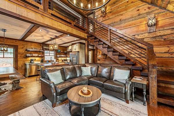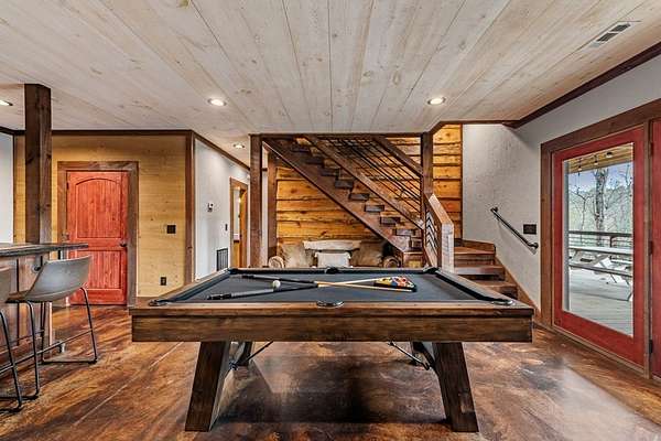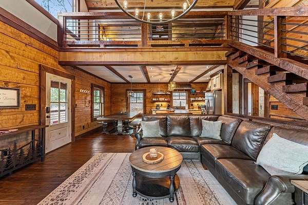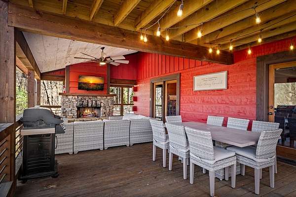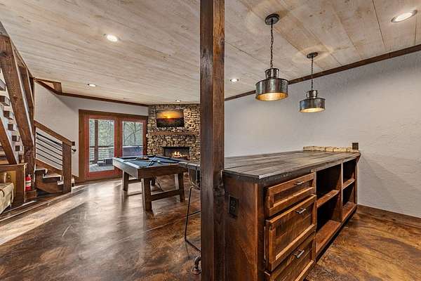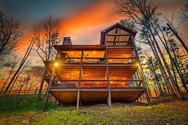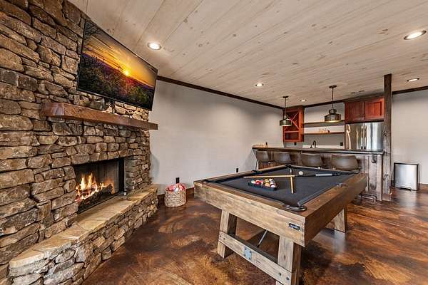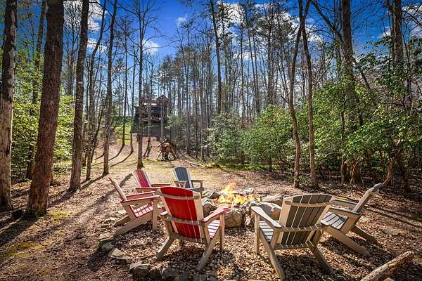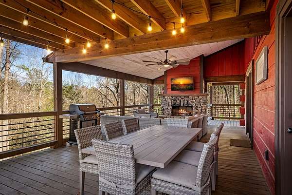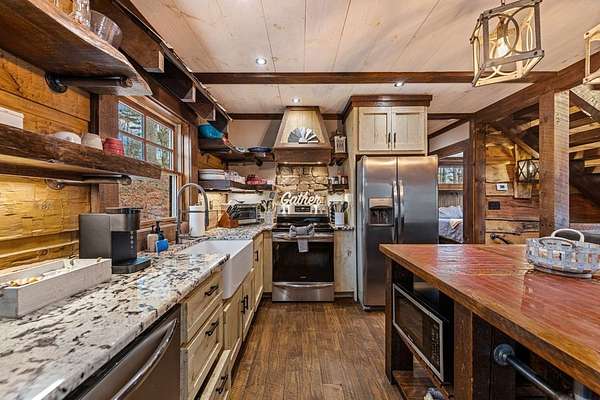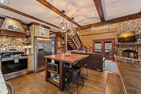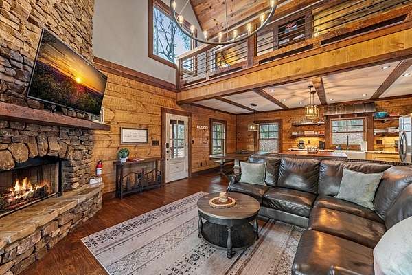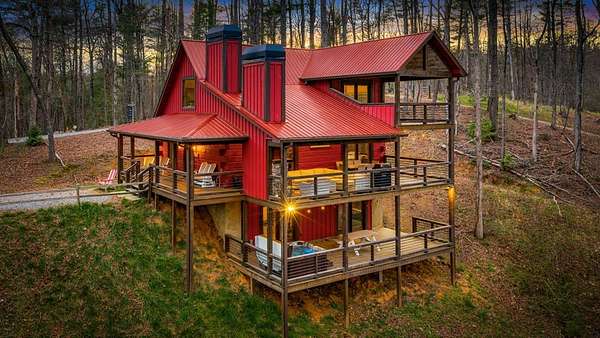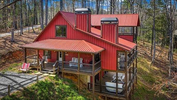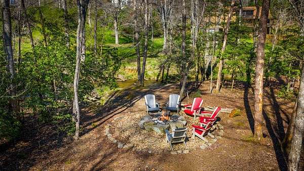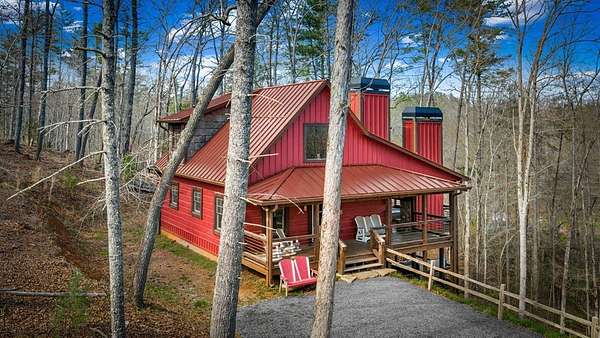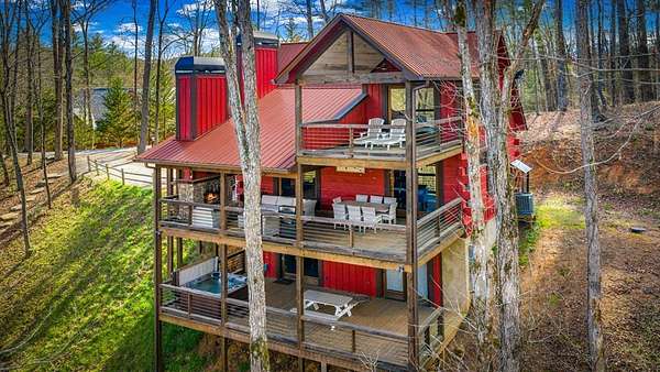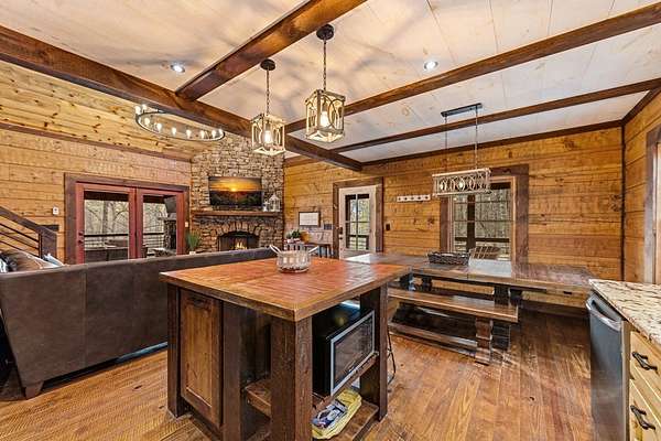 Creekside living has never looked this good! This stunning Craftsman retreat by Nicholson Home Builders is the kind of place where memories are made—whether you're roasting marshmallows by the fire, soaking in the hot tub under the stars, or listening to the peaceful sounds of the creek rolling by. Tucked away on 1.8 private acres, this 3BR/3BA getaway delivers the perfect mix of cozy charm and mountain luxury across three spacious levels. Step inside to a soaring great room with vaulted ceilings, rich wood floors, and a gorgeous custom rock fireplace that practically begs for a crackling fire and a glass of wine. The kitchen is ready for everything from pancake mornings to holiday feasts, featuring granite countertops, a center island, stainless appliances, and a farmhouse sink—all flowing easily into the dining area for effortless entertaining. The main level bedroom opens right onto the back porch, where the real magic happens: another fireplace, a BBQ grill, and plenty of space to kick back and unwind. Upstairs is a built-in adventure zone with a loft bunk area perfect for kids (or fun-loving adults), plus a spacious bedroom with its own oversized balcony—ideal for morning coffee with a mountain breeze. Head down to the terrace level and let the good times roll! You'll find a game/media room with—you guessed it—another cozy fireplace, a wet bar with full-size fridge, and easy access to the oversized porch featuring a hot tub and lounge space. Just beyond, a charming path leads you to the creekside firepit and play area, where days turn into unforgettable nights. Already part of a successful rental program, this property is as smart as it is fun—perfect for an investment, second home, or your own full-time escape. And when you're ready to explore, you're just 20 minutes from Blue Ridge, filled with local eats, unique shops, and outdoor adventures galore. This isn't just a cabin—it's your mountain lifestyle waiting to happen.