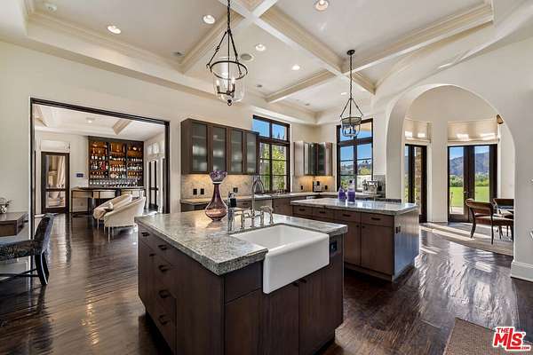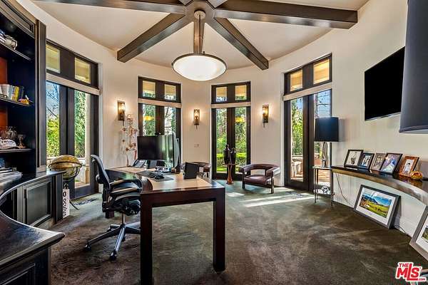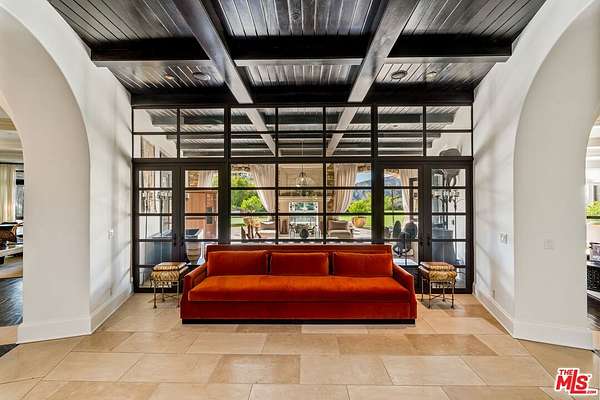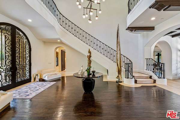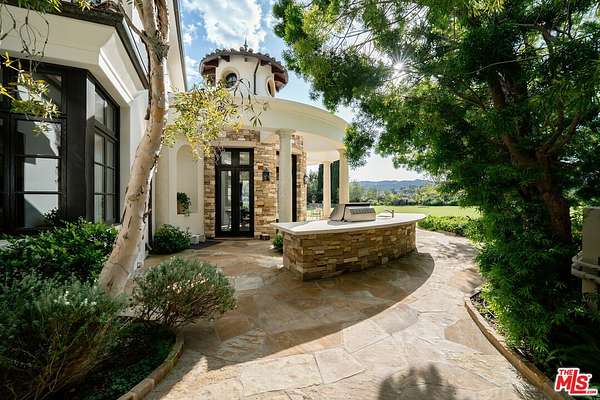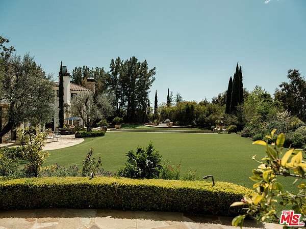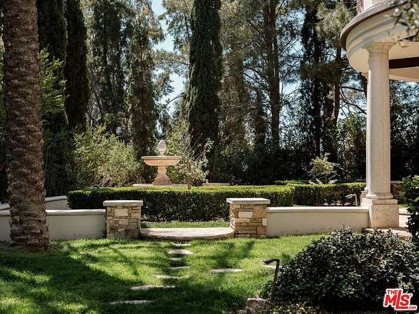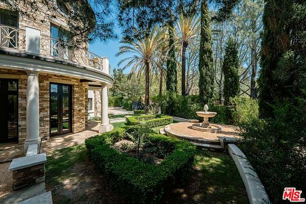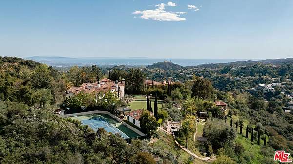 For those who seek extra privacy and security, this sprawling Tuscan residence is positioned on nearly two-and-a-half acres of pristine, manicured grounds at the end of a cul-de-sac in ultra-exclusive Brentwood Country Estates, guard-gated with 24-hour patrol. Guests arrive through a large iron gate and into a massive motor court, its perimeter lined with privacy hedges beneath towering palms and Mediterranean cypress. Enjoy striking panoramas of vivid green hills, canyons, and untouched mountains beyond. A lighted north-south tennis/pickleball court includes a trellis-covered viewing pavilion, basketball hoop, equipment storage shed, and a freestanding wellness gym for meditation, yoga, and fitness. Inside, a double-height foyer is characterized by a grand staircase and rich wood floors that flow into the public entertaining spaces. Host intimate gatherings in the family room, complete with fireplace and wet bar, or have tea in the formal living room, each space connected by a series of romantic archways overhead. The chic formal dining room connects to the kitchen via a butler's pantry, perfect for catering. Fit for a true gourmand, there are two islands with farm sink, state-of-the-art appliances including double Sub-Zero refrigerator, and chef-grade range with pot filler. There is also a sun-filled breakfast rotunda with multiple sets of French doors to the outside, creating an effortless indoor-outdoor flow for al-fresco living and dining. Upstairs, a sumptuous owner's wing contains a resort-inspired primary bedroom suite complete with fireplace, parlor, two large boutique-style closets, and a spa-inspired bath with floating dual-sink vanity, separate soaking tub, oversized rainwater shower, and toilet room. Secondary en-suite bedrooms are spacious and include private balconies and patios. There is also a theatre/media room for gaming and screening films, an office for work and study, and massage/spa room. At the center of the residence is an outdoor living room with double-sided fireplace flanked by dramatic archways. Additional outdoor amenities include a putting green, pool, spa, sundeck, organic vegetable and rose gardens, built-in barbecue, pathway to delightful garden swings, and numerous patios and terraces throughout. There is even a dog house with dedicated play space! Welcome to an extraordinary life of peace and comfort in a coveted guard-gated community in Lower Mandeville Canyon with 24-hour patrol, just moments to Brentwood's fine restaurants, Santa Monica's cafes and shops, world-famous beaches, and all the Westside provides.