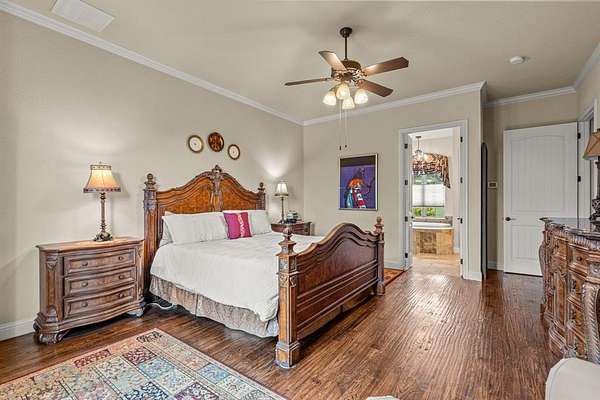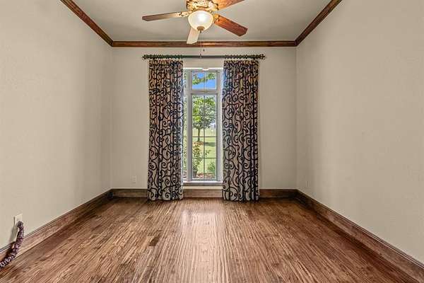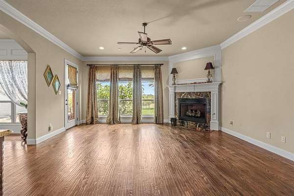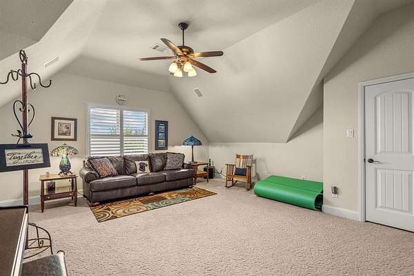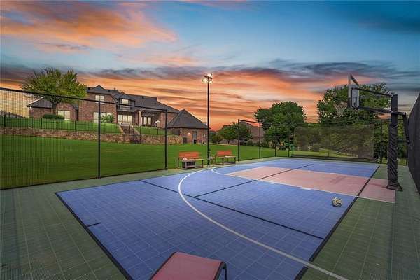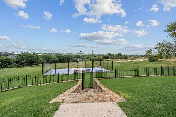 Perched atop a scenic hill in the gated community of Bella Flora - Bella Ranch, this exceptional property spans 2.87 acres and captures sweeping skyline views of Fort Worth. Thoughtfully designed for both everyday living and effortless entertaining, the home offers 3,722 square feet of beautifully appointed space, including 4 bedrooms and 4 full bathrooms. The main level features a serene primary suite, a private guest bedroom, a dedicated home office, and both formal and casual dining areas. The formal dining opens to the living room and includes a stylish wet bar. At the heart of the home, the kitchen impresses with a large center island with prep sink, double ovens, and generous storage. Upstairs, you'll find two spacious ensuite bedrooms and a second living area--ideal for a game room, media lounge, or teen retreat. Step outside to enjoy wide-open green space, a covered patio with a built-in grill, and a full sports court equipped for basketball, tennis and volleyball --complete with a rebounding net and lights for nighttime play. There's plenty of room to add a custom pool, and with ACC approval, the lot also allows for a guest house or workshop. Additional highlights include hand-scraped hardwood floors, a 4-car garage, and a side-entry porch with direct access to the kitchen--perfect for everyday convenience. Well: new pump in 2019, new control box in 2020. This is Texas living at its finest - luxury, land, and lifestyle, just minutes from Fort Worth's top-rated private schools, premier shopping, dining, and with convenient access to the property off 377. Foundation: Engineered post tension and pier.