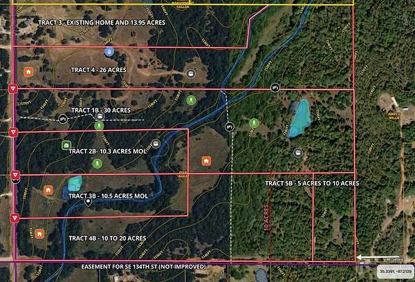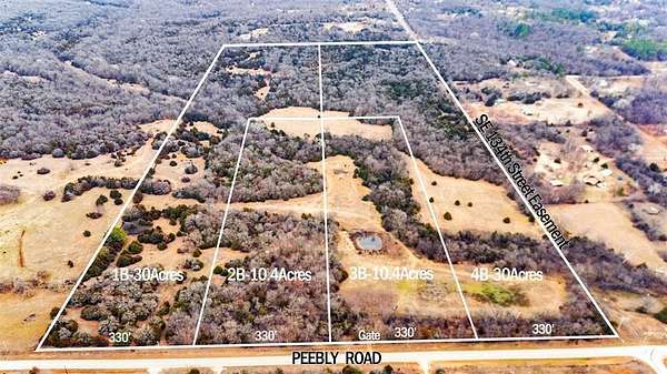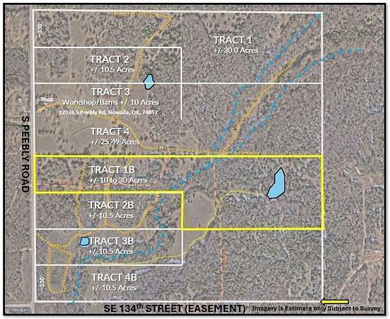 Beautiful high ground 30 acres of prime land available for purchase-Tract 1B (you may add Tract 4 which is 30 acres and make 60 acres). This exceptional property is located within an established neighborhood, just off the asphalt road (Peebly Road), offering a tranquil and serene environment. The land is adorned with a mature variety of trees and open meadows, creating an ideal backdrop for building your dream home. Large pond in back allows you to have a scenic backdrop for your home or barndo. The area is teeming with wildlife, including abundant deer and turkey, offering a private and peaceful setting. Enjoy the perfect blend of seclusion and convenience, with easy access to major routes-just 20 minutes from Norman/OKC, 3 miles south of I-40, and 4 miles southwest of the Kickapoo Turnpike. Additionally, this property is only 10-15 minutes from Tinker AFB, Boeing, OK Heart Hospital, Grand Casino and Resort, shopping centers, restaurants, and cinemas. The land is zoned RA SFR One-Acre Rural Residential District with the OKC Lot application process in place. Power and fiber are available at the street, and the buyer may install a private well and aerobic system. With an expansive 330' x 2700' layout (~30 acres), the parcel will be surveyed and split from the parent tract at the time of escrow. Buyers have the flexibility to purchase between 30 to 60 acres in total. This property is ideal for those seeking a private residential haven with excellent access to all the amenities and attractions of the area. Please note that the property tax currently reflects the parent tract and may adjust upon splitting for a single-site development. For further details or to schedule a visit, please contact the agent. Tenant is on-site. GIS coordinates: 35.3349, -97.2125.