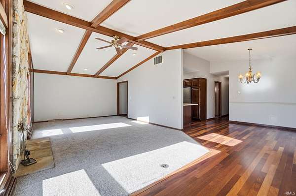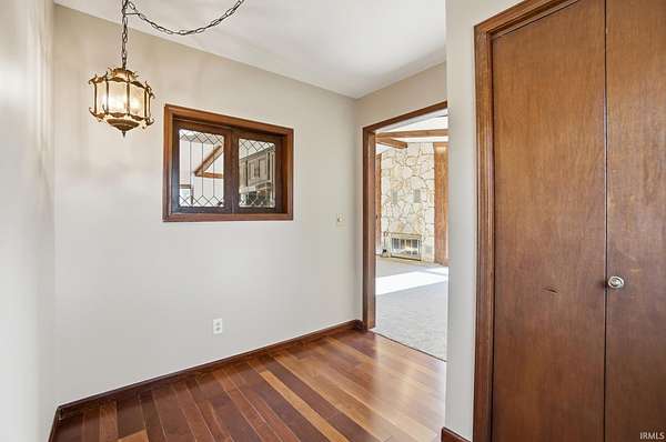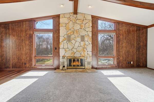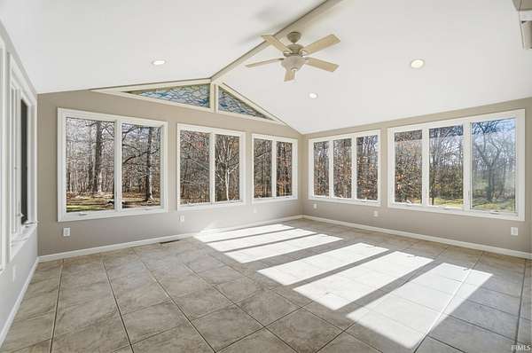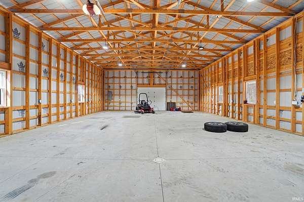 Discover serene country living on rolling 8-acre property featuring partial woods, trails, & creek along property line. This charming ranch on daylight basement is set far off road for exceptional privacy. Outdoor living abounds w/ upper Trex deck, spacious paver patio, & covered lower patio overlooking scenic grounds. Brand-new 2023 pole barn (nearly 1,600 sq ft) provides incredible versatility, offering three overhead doors (approx. 16', 12', & 8' heights), 200-amp power, wiring for a welder, & electric heat capability. Inside the home, Great room impresses w/ floor-to-ceiling stone fireplace, beamed cathedral ceiling, & beautiful views. The light-filled 4-season room offers windows on all sides for year-round enjoyment. Centrally located kitchen includes all appliances, bar-stool seating, & open dining area w/ bay window. Fresh paint on both levels, brand-new carpet & bathroom flooring. Move-in ready! Main level features primary suite, while lower level offers 2 additional bedrooms, full bath, & dedicated den w/ built-in desk cabinetry. Additional structures include bonus flex building (sold as-is) & large, cute shed. Zero-turn mower negotiable. Enjoy the rare combo of natural gas & city sewer on a private country property approx. 1mile from I-469. A true must-see! *Also, an Investment opportunity w/ adjacent triplex for sale at 12717 US 27.