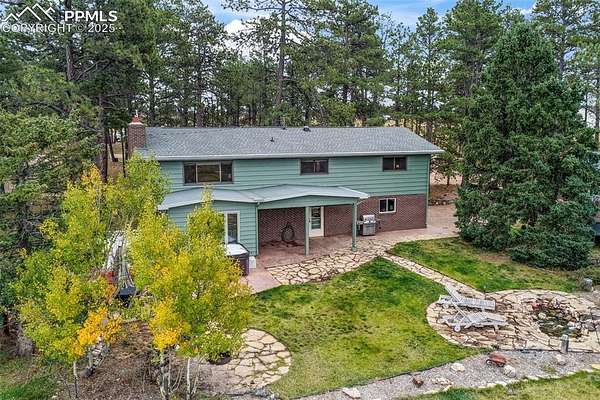 Welcome to this beautiful ranch-style home nestled on 4.77 acres in desirable Black Forest-where breathtaking Pikes Peak views and peaceful country living meet comfort and convenience. With no HOA, you'll have room to spread out, park your RV or trailers, and even bring your animals-yes, chickens are allowed! The property features both a two-car attached garage and a two-car detached garage/workshop, offering abundant space for vehicles, hobbies, or storage. Outside, unwind in the hot tub, listen to the tranquil water feature, or enjoy the play set in the spacious backyard. Recent updates include a new septic and leach field sized up to accommodate home expansion (2020), Class 4 roof (2023), radon mitigation system, new pressure tank (2020), water softener and humidifier (2023), and fresh exterior paint (2025). Step inside to find a bright, welcoming interior with updated lighting, an open-concept kitchen featuring granite countertops, stainless steel appliances, a cooktop with hood vent, under-cabinet lighting, and plenty of cabinet space. The dining room flows effortlessly into the family room, highlighted by a real wood-burning stone fireplace and wooden mantle-perfect for cozy Colorado evenings. Upstairs, you'll find the primary suite with attached bath, plus two additional bedrooms and a full bath. The walk-out basement offers an expansive recreation room with a gas fireplace, a sunroom with tile floors, and access to a covered patio overlooking the large backyard. A fourth bedroom, three-quarter bath, and second kitchen make this level ideal for multigenerational living or guest accommodations. Conveniently located near Colorado Springs with easy access to Highway 83, this home combines the tranquility of rural life with close proximity to city amenities. If you're looking for privacy, space, and mountain views-this is the one!