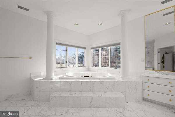 Exquisite Custom Estate on 5+ Acres with Bath House & Guest Quarters, Elevator & Resort-Style Grounds Privately sited on 5.13 acres, this exceptional custom residence by Vintage Homes offers timeless elegance, thoughtful design, and resort-level amenities in Ellicott City. A circular drive, four-sided brick exterior, covered brick front porch, and professionally designed hardscape set the tone for this impressive estate. The main residence features generously sized rooms, solid end-grain wood floors, solid core interior doors, 6"" interior walls, plantation shutters, and abundant storage throughout. A dramatic double staircase graces the entry foyer, complemented by a secondary rear stair and a private elevator with new hydraulics for seamless access to all levels. Formal living and dining rooms are anchored by gas fireplaces, while the family room showcases a Palladian window and dual access to two expansive patios-ideal for indoor-outdoor entertaining. The sunroom offers vaulted ceilings and skylights, flooding the space with natural light. Designed for both comfort and functionality, this luxury home includes a commercial-grade gas line for a future generator, radon mitigation system, and a fully finished lower level with double-door walk-up, recreation room, kitchenette/wet bar, office, and extensive unfinished storage. The outdoor living experience is unparalleled. Enjoy a heated in-ground saltwater pool with fountain, hot tub, exterior sound system, mature trees, garden walls, and multiple patio areas-perfect for entertaining or quiet relaxation. A remarkable 1,800-square-foot detached bath house and guest quarters with dedicated utilities offers endless possibilities for extended family, guests, or au pair accommodations. Additional highlights include a four-car side-loading garage with extra side parking, in-ground pool infrastructure, professional landscaping, and well and septic systems. Offering 5 bedrooms, 4 full baths, and 2 half baths, this transitional-style estate delivers privacy, quality construction, and refined living-just minutes from commuter routes, dining, and shopping. A truly rare offering combining luxury, scale, and versatility in a premier Howard County setting.