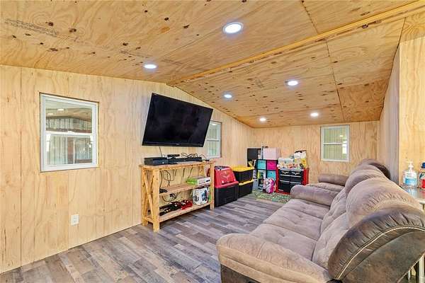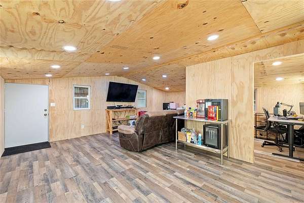The 3,160 sq. ft. shop includes a 6 inch concrete slab, two roll-up doors, water, electric, plumbing for a bathroom, and two finished upstairs rooms office + game, family room with solar mini-split AC. Shop could be converted into a second residence.
