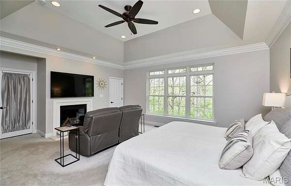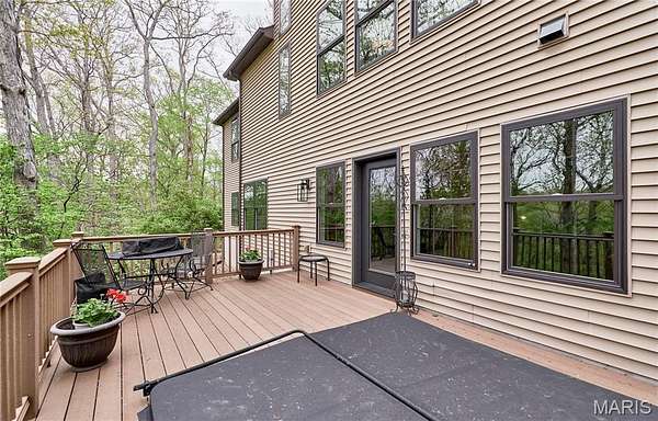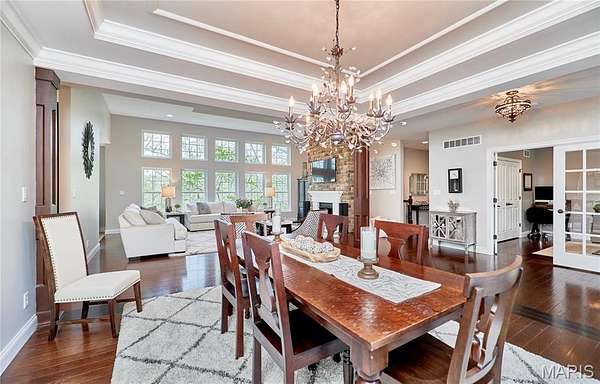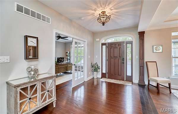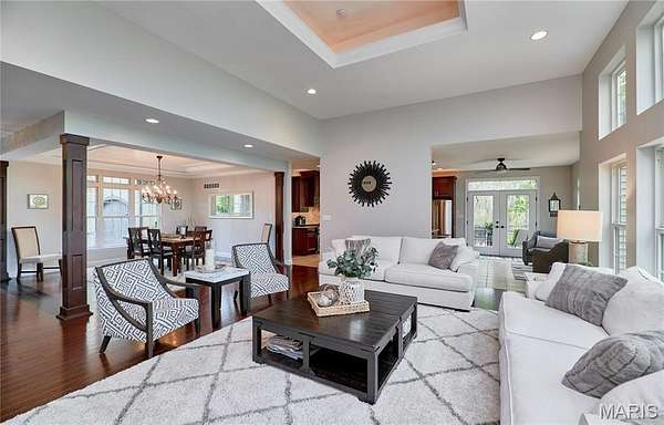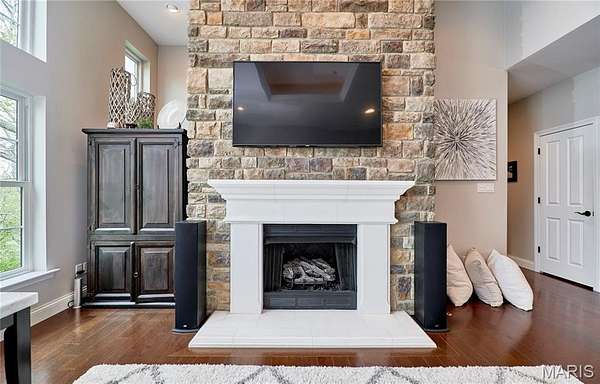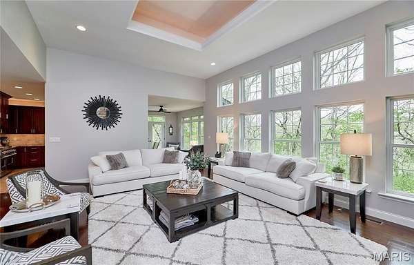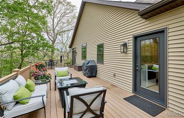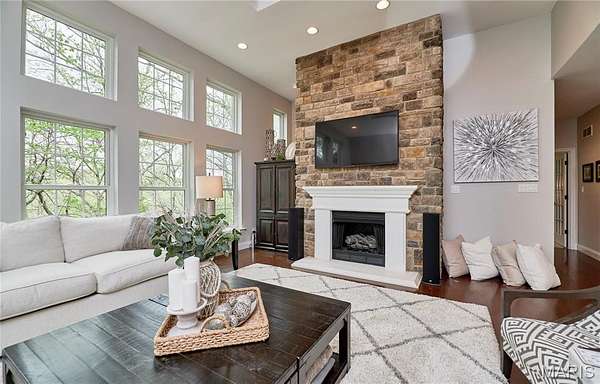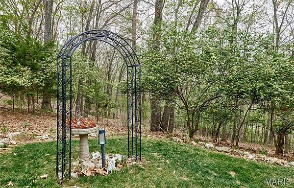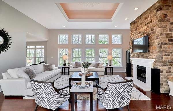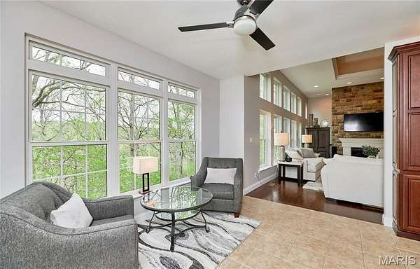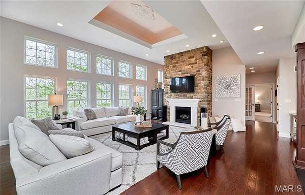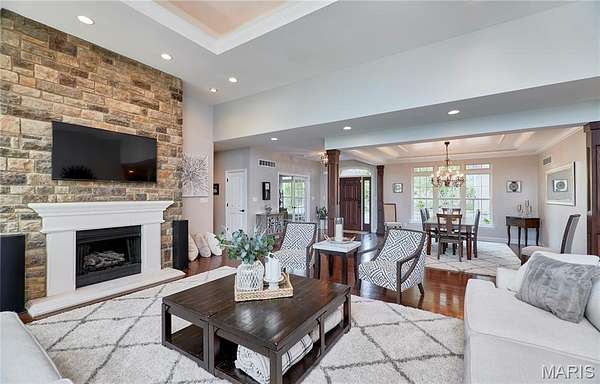 Exceptional custom ranch on a private 2-acre lot, ideally positioned within a gated enclave overlooking Paradise Valley Golf Course. An impressive stone exterior and welcoming covered porch set the tone for this thoughtfully designed home. Rich wood flooring extends through the entry foyer, office/den, formal dining room, and great room. The foyer is flanked by a private office with French doors and an elegant dining room accented by a tray ceiling. The great room impresses with a dramatic wall of windows, a soaring 12-foot tray ceiling with custom lighting, hardwood floors, and a striking stone fireplace, offered as a decorative-only element. The gourmet kitchen is designed for both everyday living and effortless entertaining, anchored by a professional-grade Viking stainless steel gas range with double ovens, commercial-style burners, and an integrated griddle. Custom cabinetry, granite countertops, and an expansive center island with breakfast bar seating are complemented by a built-in drawer microwave with child-lock feature. A light-filled sitting room with French doors opens to the large side deck—creating seamless indoor-outdoor living with scenic views. The stunning main-level primary suite overlooks a private, wooded backdrop and is enhanced by crown molding, a deep tray ceiling, and a cozy fireplace. A spacious walk-in closet adds to the suite’s appeal. The spa-inspired primary bath offers a freestanding soaking tub, dual vanities, and a custom walk-in shower with two separate shower spaces connected by a distinctive half-moon bench. A large window fills the space with natural light, while a separate water closet enhances the sense of privacy and retreat. The spacious main-level laundry room is well-appointed with abundant cabinetry, generous countertop space, and a utility sink, providing everyday convenience and functionality. The finished lower level offers a spacious family room, a full bath, and four additional bedrooms, one of which is currently utilized as a home gym. Multiple lower-level bedrooms feature walk-in closets, and one includes a private en-suite full bath. The family room provides direct access to the back deck, complete with new outdoor lights (2026) and new hot tub (2020), creating an ideal setting for relaxation or entertaining. Additional highlights include an irrigation system and newly updated landscaping completed in 2026.