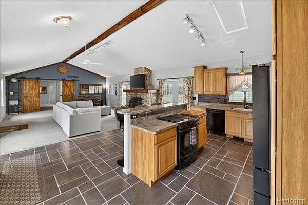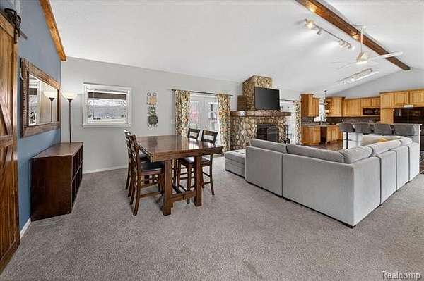 The kitchen is the heart of the home with hickory cabinetry, above-cabinet lighting, tiled backsplash, and a center island with raised snack bar. It flows seamlessly into the dining area and great room, where vaulted ceilings, abundant natural light, and a cozy wood-burning fireplace create a warm and inviting atmosphere. The fireplace is also plumbed for natural gas if preferred.