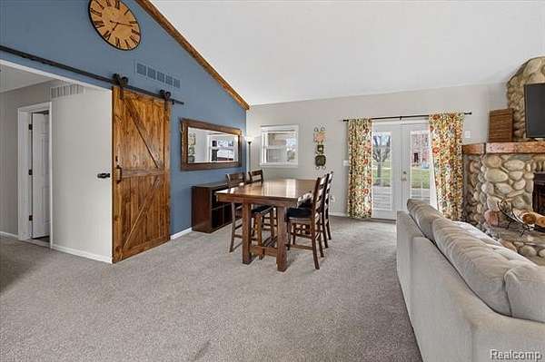 Just beyond the sliding barn doors are three bedrooms, including the primary suite with a private bath and walk-in closet. Two additional bedrooms provide flexibility for family, guests, or office space.