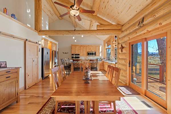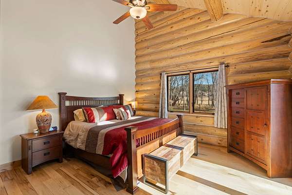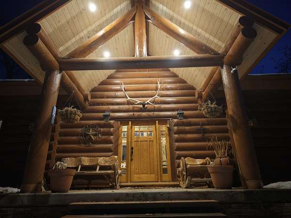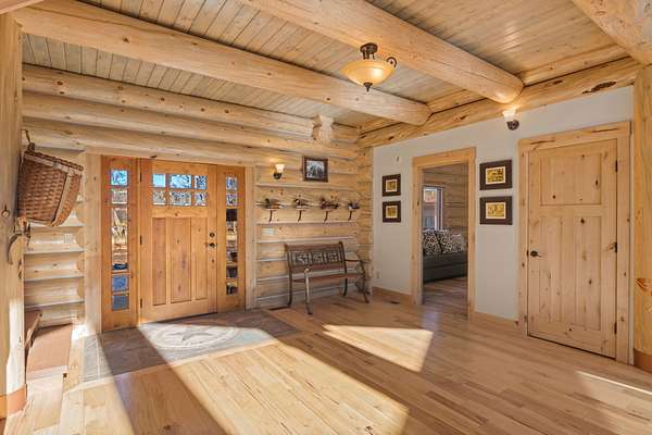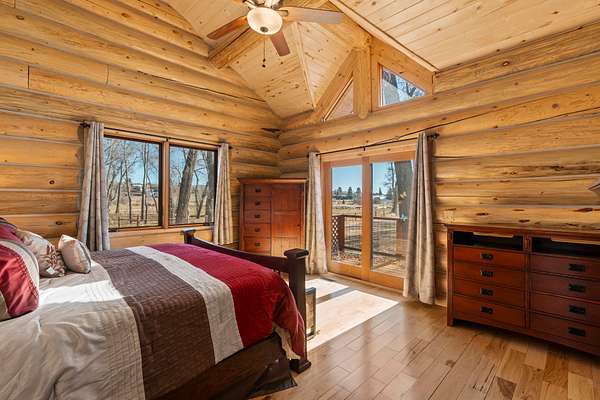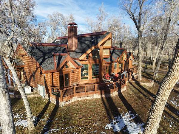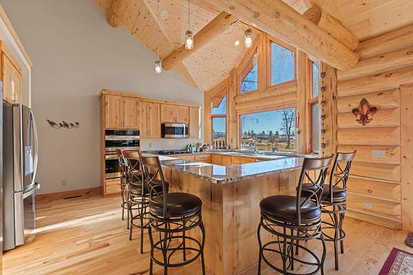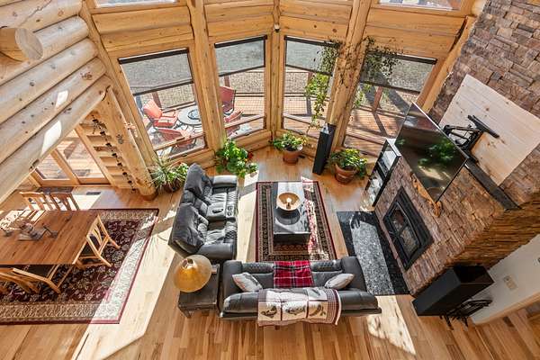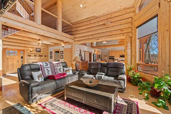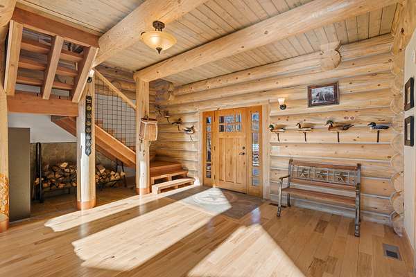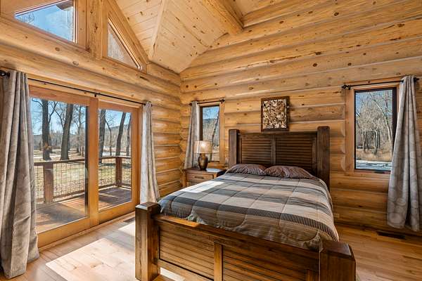 Tucked into a peaceful, park-like setting, this stunning 2,678 square foot Colorado-style log home offers the perfect blend of rustic charm and refined comfort. Massive south-facing windows flood the interior with natural light while framing serene views of the surrounding landscape, creating a seamless connection between indoors and out. The setting is remarkably quiet, with the gentle sounds of a nearby river providing a soothing backdrop to everyday living.