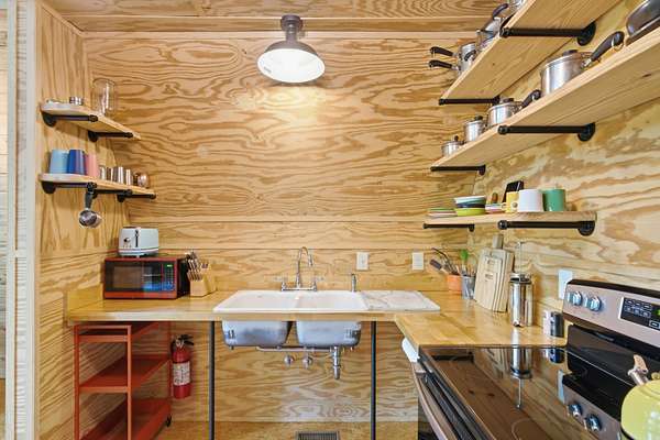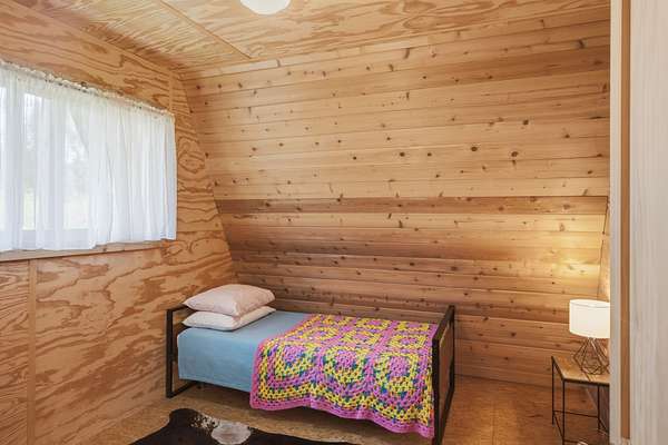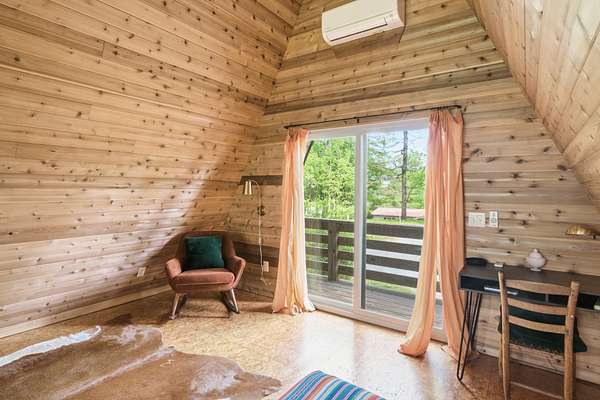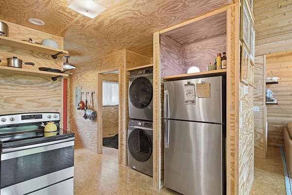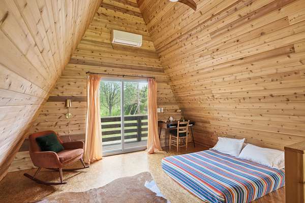 This unique cabin has a full bedroom on the main level and a charming loft bedroom. Open living space is flooded with light and gorgeous cedar ceilings throughout. It is outfitted with modern amenities such as a full kitchen with range, large refrigerator and microwave, large walk-in shower with gorgeous tile work, and full-size washer and dryer.