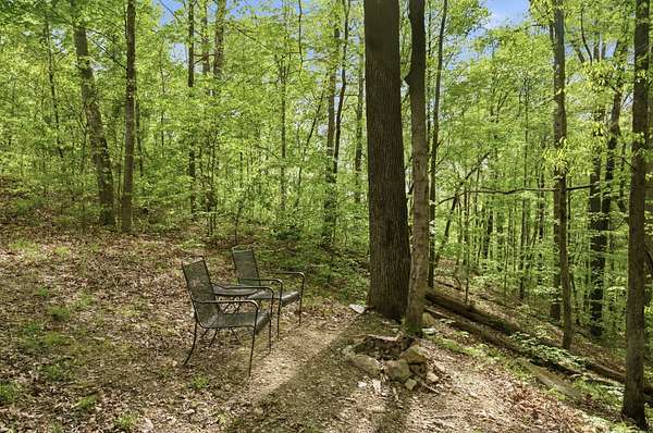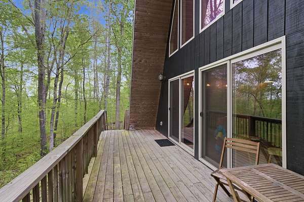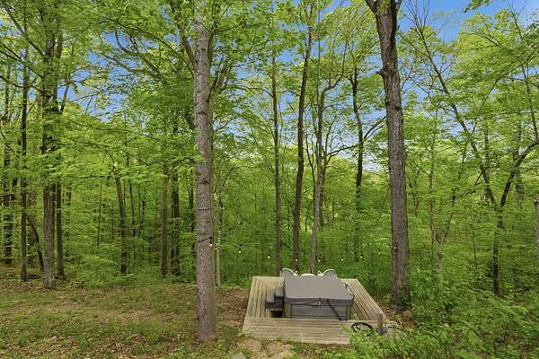 Situated on 3+ private wooded acres, the property offers a serene natural setting with a private balcony and deck and hot tub.