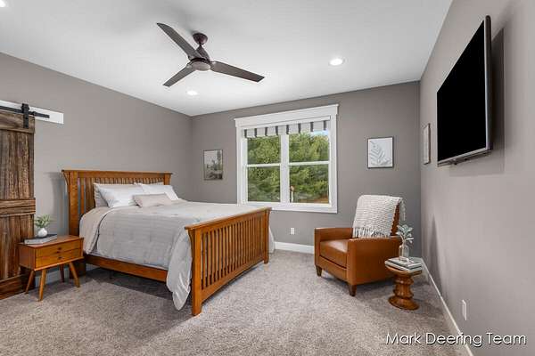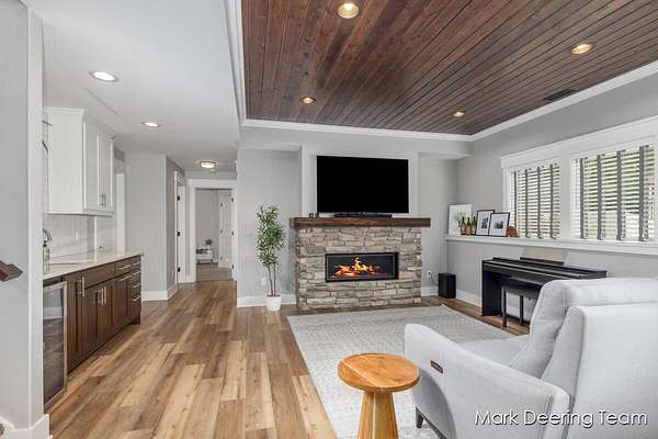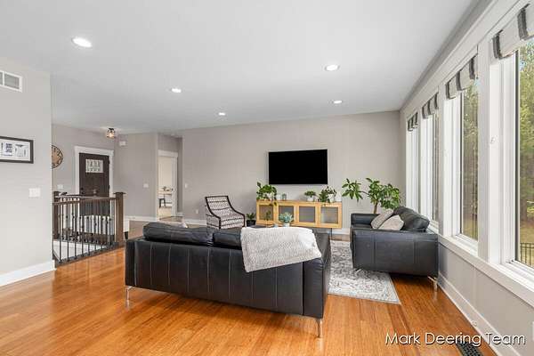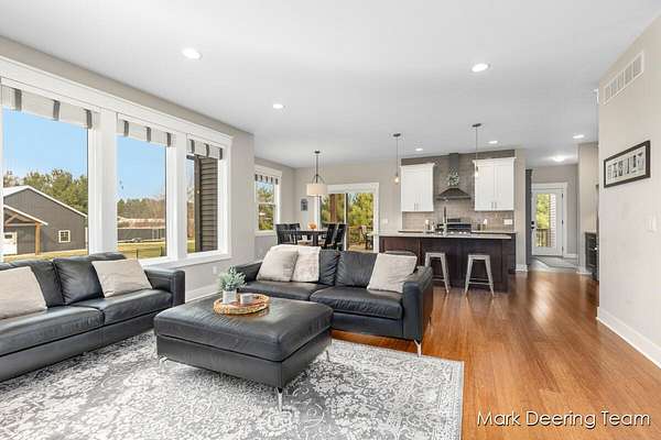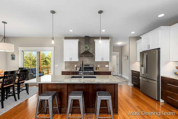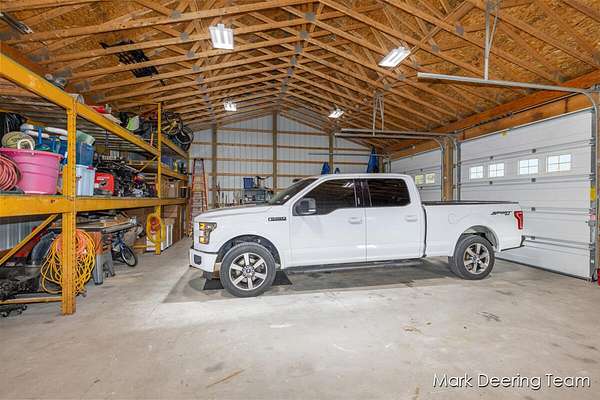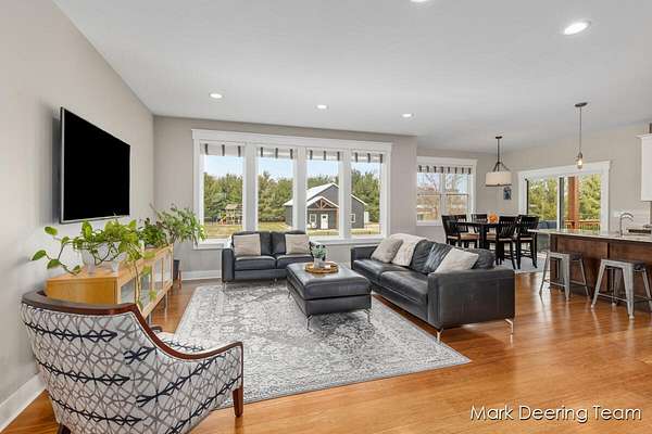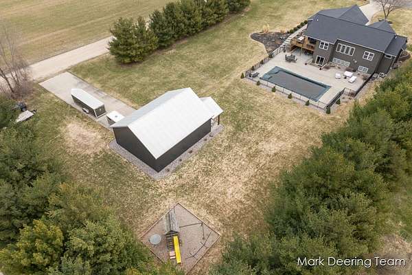 Welcome to your dream property! Acreage, giant pole barn, newer construction with high-end finishes, in-ground pool, and all the entertaining space you could want! Step inside to a stunning wall of windows filling the home with natural light, complemented by 9-foot ceilings and warm bamboo floors. The kitchen is perfect for gathering, featuring hard surface countertops, a large center island with a deep sink, walk-in pantry, and subway tile backsplash. The primary suite is a true retreat with a soaking tub, tiled glass shower, vanity area, and walk-in closet with built-in shelving. The finished walkout lower level continues the high-end feel with a fireplace, wood accent ceiling, kitchenette, two bedrooms, and a flexible third room. Outside, enjoy a private, tree-lined yard with an in-ground pool. A heated three-stall garage and a large pole barn with its own driveway provide plenty of room for storage, hobbies, and all your toys. Don't miss your chance to make this your home!