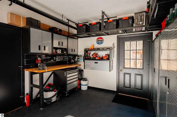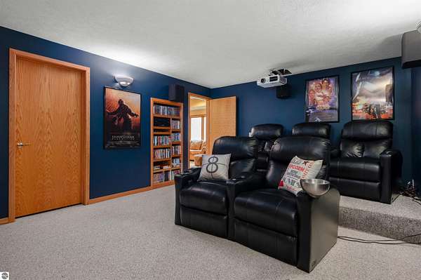 Welcome home to this beautiful, well-maintained 5-bedroom (plus an office), 3.5-bath home with 3,500 sq. ft. Set on 10 wooded acres at the end of a quiet cul-de-sac, this Leelanau County gem offers exceptional privacy and only 15 minutes to downtown Traverse City. Entering the front door, you'll be welcomed into the living room with a soaring two story ceiling and a cozy fireplace, looking out over a serene wooded setting. The spacious island kitchen features newer appliances and a large wall pantry. A convenient main-floor laundry and mudroom with built-in cubbies and a half bath sits just off the heated three stall garage, which includes a new storage system and access to a bonus room above, ready for your finishing touches. The main floor primary suite offers a large walk-in closet and a newly updated luxury bath. Upstairs you'll discover two generously sized bedrooms and another full bath. Additional living spaces, perfect for entertaining, include a formal dining room and a finished walkout lower level with two additional bedrooms, an office, and a dedicated theater room. Outside, enjoy beautiful landscaping, a large custom patio with firepit, an adorable playhouse, and even a maple syrup making sugar shack. Energy-efficient geothermal heating and cooling keep utility costs impressively low. See associated documents for a full list of updates. Don't miss this exceptional property!