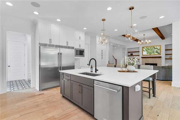This extraordinary estate offers a rare opportunity to own a property that blends the ultimate in luxury living with resort-style amenities. Situated on 2.5+/- acres of lush landscaped grounds in a prime school district, this home is designed for entertaining, relaxation, and everyday comfort at the highest level. Inside, you'll find gorgeous modern finishes with cedar beams throughout the main level, an open floor plan with a large family room that includes built-ins, cozy stone fireplace and sliding doors opening the indoors to the outdoors. A massive gourmet kitchen featuring an oversized island with seating for up to 10, quartz countertops, double ovens, oversized refrigerator, and a vented range with hood. A vaulted keeping room/ breakfast area with shiplap and custom lighting adds to the charm of this spectacular home! This luxury kitchen also offers a custom walk-in pantry with a grocery door makes everyday living effortless. The main-level primary suite is a private retreat with soaring ceilings and a spa-like bath including a soaking tub, oversized shower, and double vanity. Owner suite closet includes custom built-ins, island with drawers, makeup vanity/desk and FULL laundry with sink! Upstairs, four spacious secondary bedrooms each offer their own private en suite bath and walk-in closets. A second fantastic laundry upstairs with cabinets and sink. The finished terrace level includes a sixth bedroom, full bath, a state-of-the-art media room with seating for 10 and an incredible sound system, a fitness room, and a rec room. Terrace level also offers a third laundry making laundry a breeze on any floor! A whole-home speaker system carries throughout the interior and exterior, creating the perfect setting for entertainment.