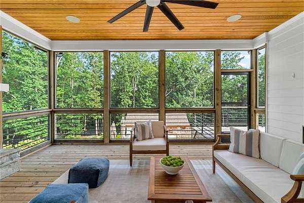 The backyard is a true PARADISE with diving ledges, resort-style slides, waterfalls, grottoes, tanning ledges, and a massive hot tub, along with pickleball and basketball courts, a putting green, and an in-ground trampoline. Outdoor living continues with a full kitchen, outdoor bathroom, sauna, private outdoor shower and spectacular outdoor fireplace tucked in the trees for majestic evenings! Covered and screened deck with fireplace is the perfect spot for morning coffee! Custom lighting enhances both the home and backyard, creating a stunning evening ambiance, while a full irrigation system keeps the grounds lush and a full house generator provides peace of mind. A rocking chair front porch adds classic Southern charm, while the attached two-car garage and detached two-car garage provide space for four vehicles in total. Above the detached garage, a private office / bonus space is ideal for a home office, studio, or man cave. The property also features a private hiking trail that leads directly to Canton Creek and waterfall.